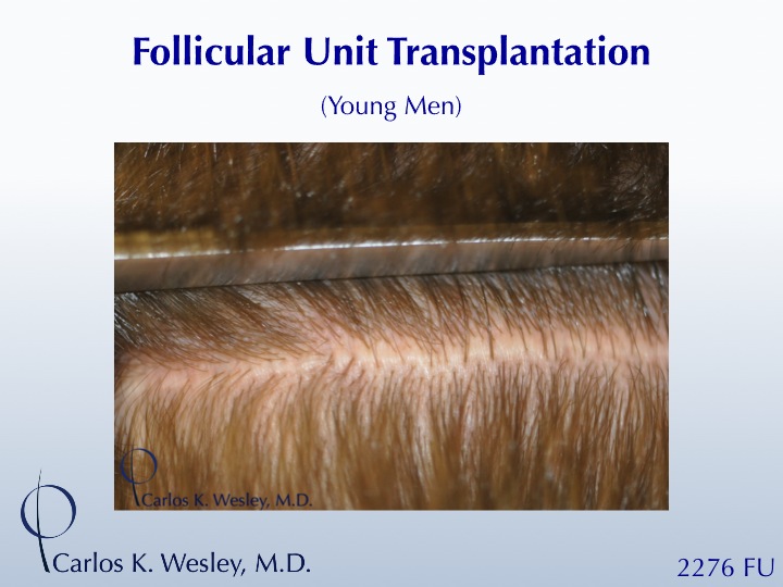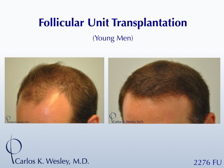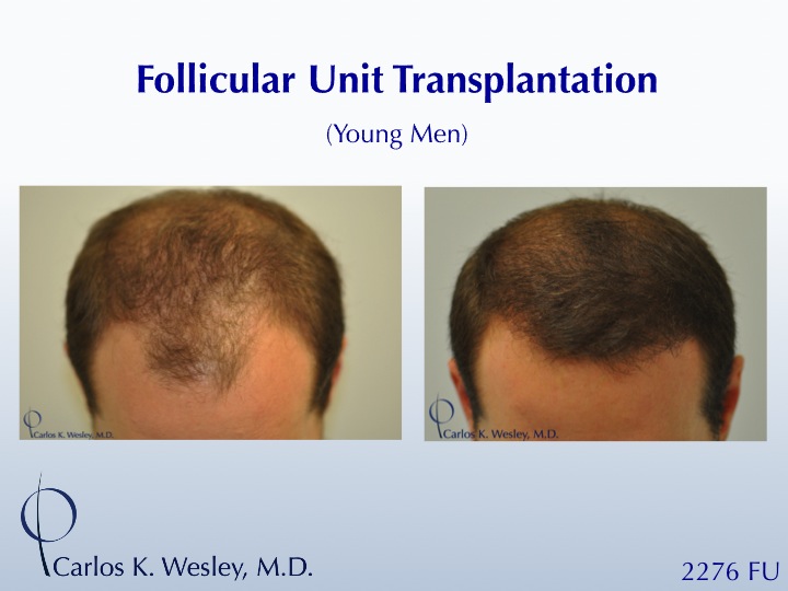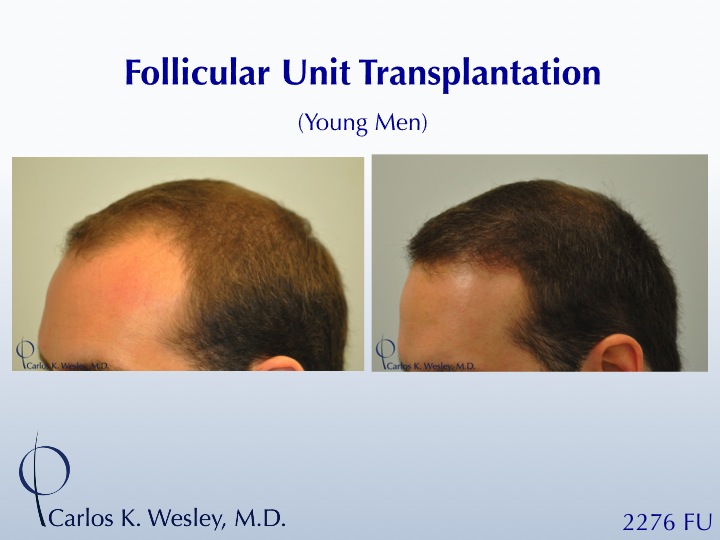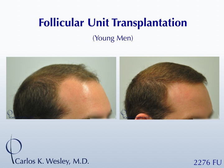 This 28-year old patient was most concerned with a natural appearance after surgical hair restoration. He can be seen before and nine months after a 2276 graft session with Dr. Wesley.