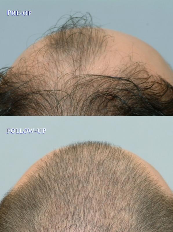 Below are pre-op and post-op photo comparisons that depict a 24 month result of a class 4 potential class 5 patient who desired an overall thicker front via CIT (Cole Isolation Technique), a non-strip hair transplant method. The patient has medium fine, wavy hair and slightly above average donor density of about 200 hairs per square centimeter with 180 hairs/cm2 being about the average. Dr. Cole’s treatment plan was to strategically transfer about 2500 CIT grafts to the front in order to minimize shock loss. Shock loss is usually a temporary condition that generally occurs when pre-existing hair is shed due to trauma from newly transplanted follicles. For most patients, shock loss is catastrophic and can cause significant inconvenience for at least a couple of months after a hair restoration procedure.