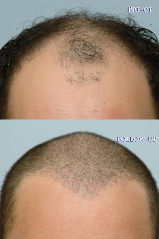 If a photo is worth a thousand words, these photos say it all. Finally, the patient’s self-conscience behavior has turned into self-confidence and the new appearance is remarkable. Here is another successfully treated patient who has also avoided the linear scar of strip method.