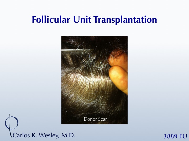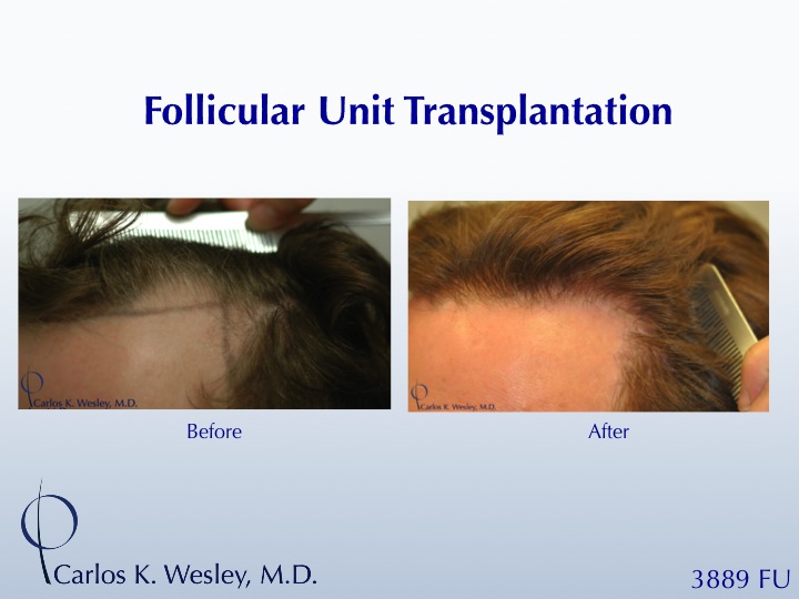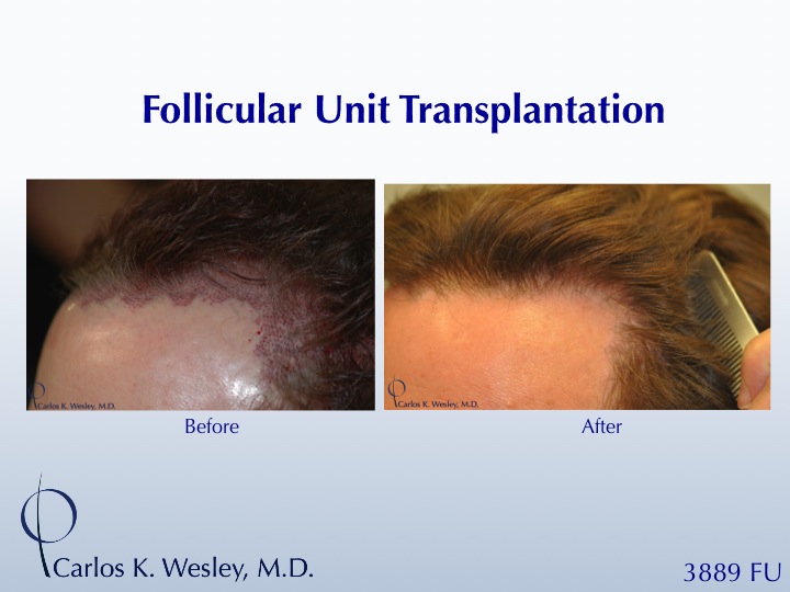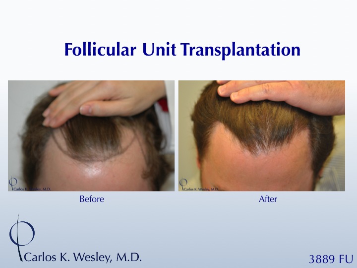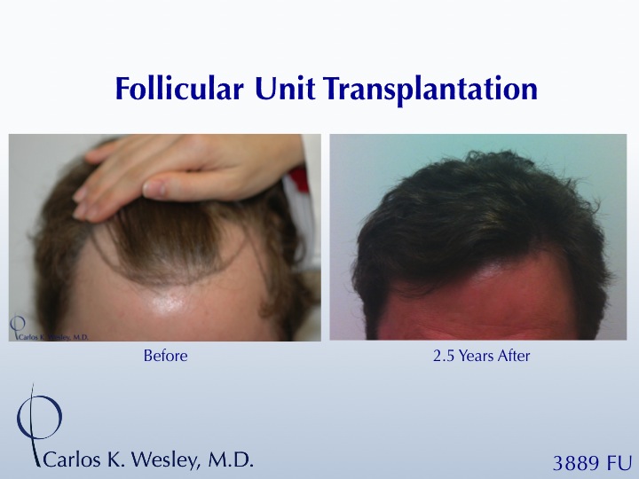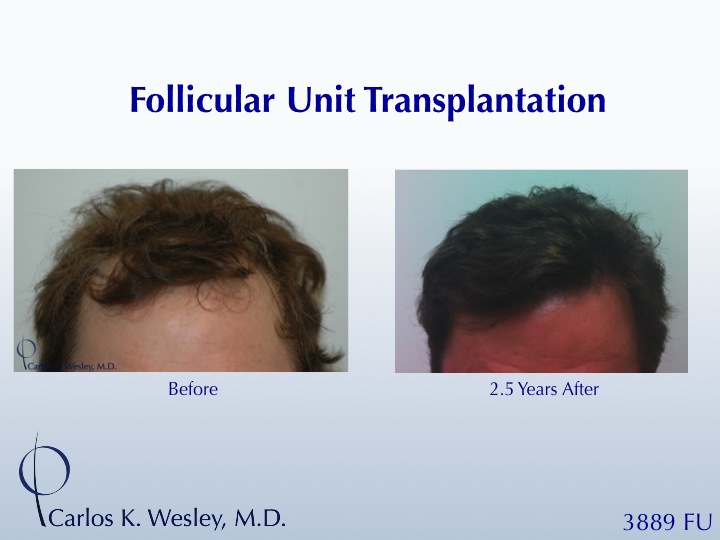A 57-year-old man received a total of 3889 FU throughout the frontal third of his scalp over 2 sessions. He returned approximately one year after treatment for follow up pictures in our office. He was then subsequently seen by me during an off-site visit just over 2 years later. Interestingly, new growth of transplanted hair has been shown to continue even 18 months after a session!