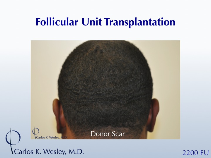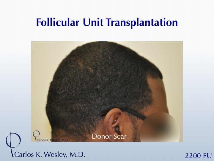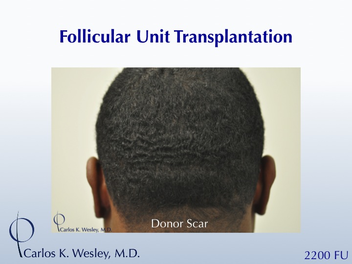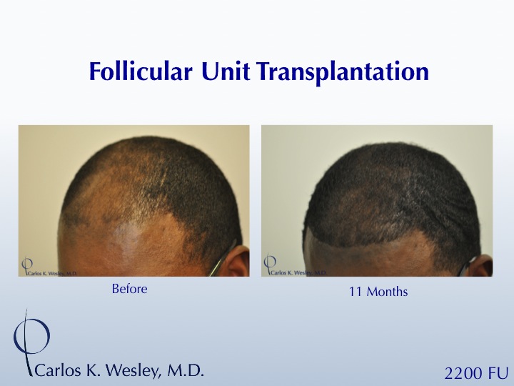 This 35-year-old African-American male sought treatment for his rapidly-thinning scalp. He underwent a 2200-graft FUT session with Dr. Carlos K. Wesley in NYC. The patient returned to the office about 11 months later wearing the same short hairstyle.