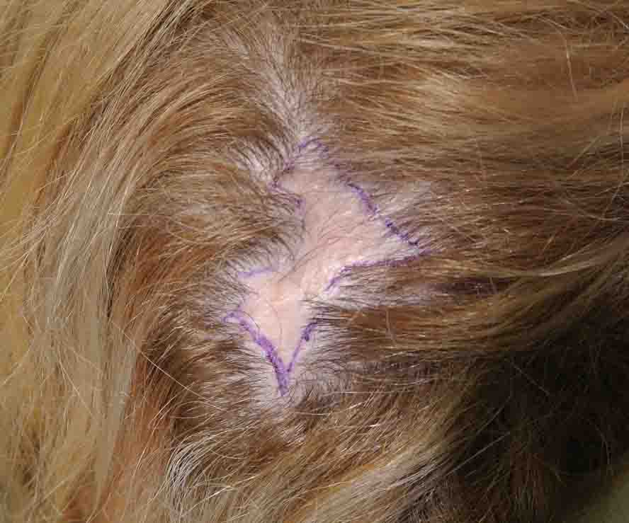 This very attractive Serbian female presented with a history of burn to her scalp 25 years ago. As her hairstyle has changed, she finds that although she has lots of surrounding hair, this hairless scar requires care to conceal.