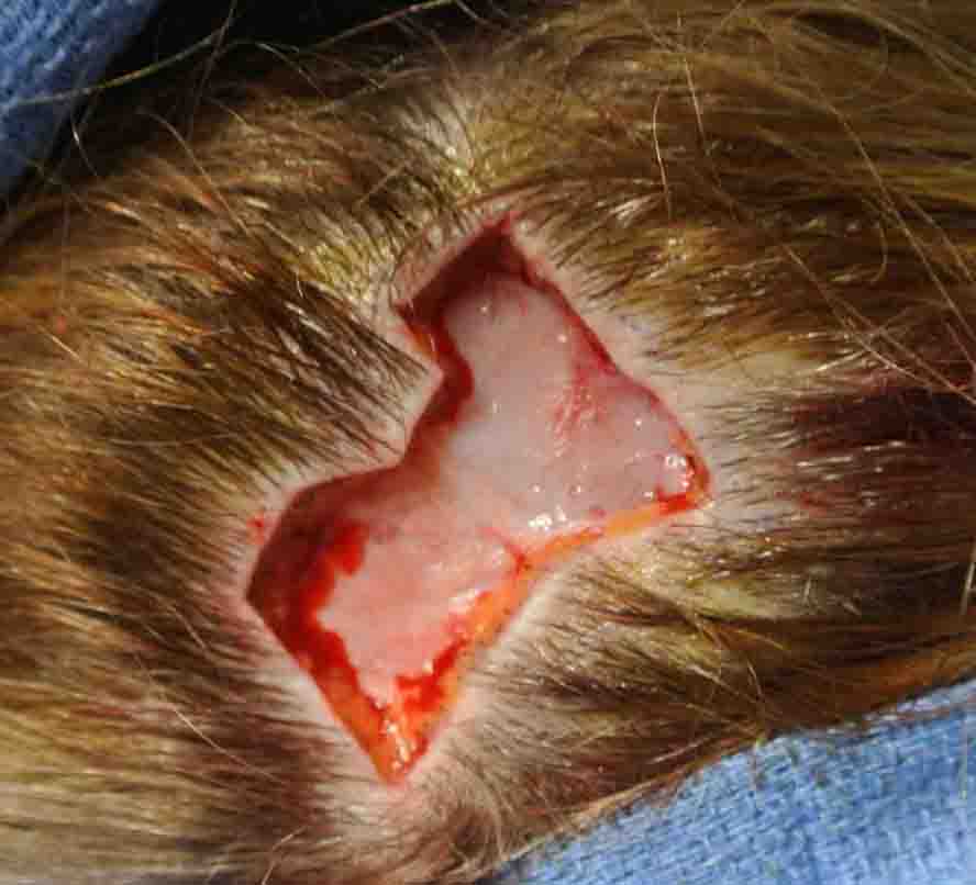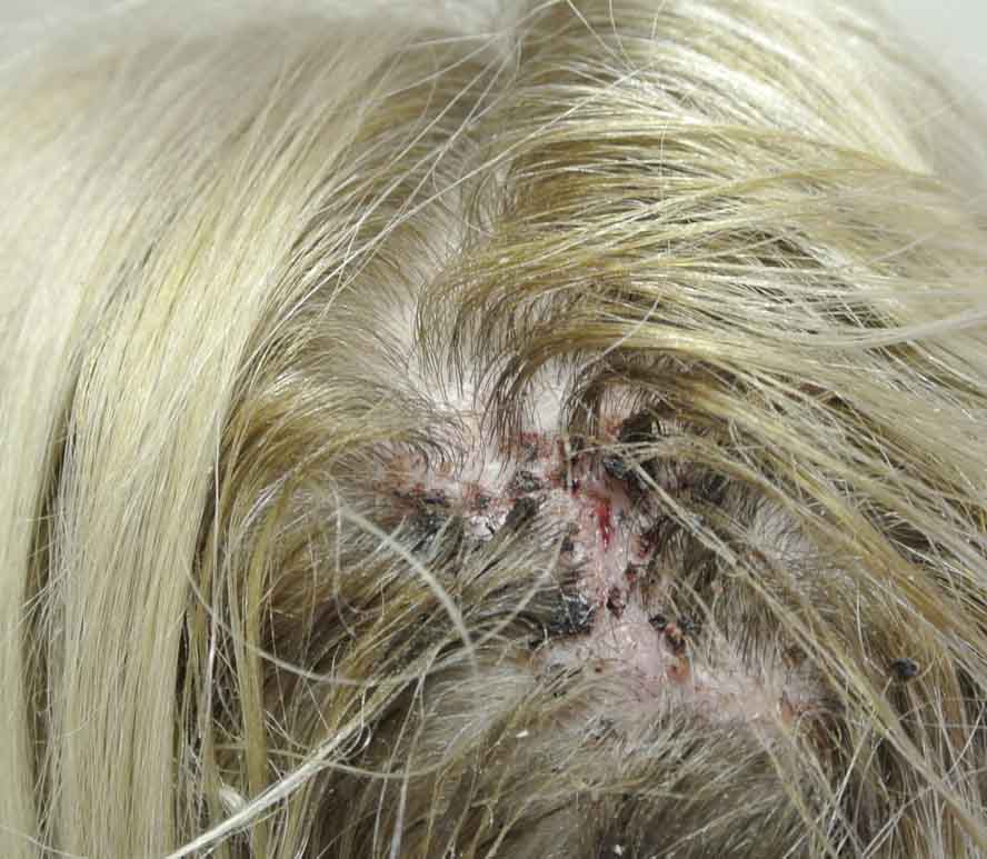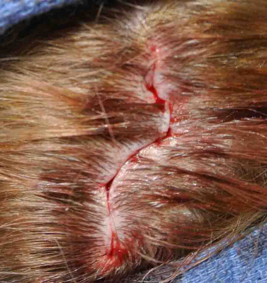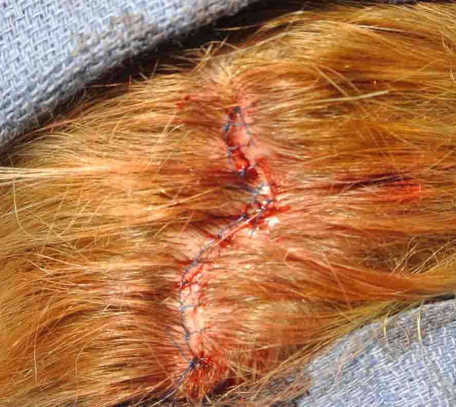 But, as is shown on these pictures, I was able to remove the entire scar and close the wound with 3 layers of sutures thereby taking the “load” off of the skin edges which ought to minimize scar re-widening. Also, she really didn’t bleed at all and needed no cautery…also which may have prevented injury to nearby follicles. The last picture is on day 7. She did no cleaning due to anxiety, and wouldn’t come in for postop cleaning as requested…so its not as pretty of a picture as I’d have liked.