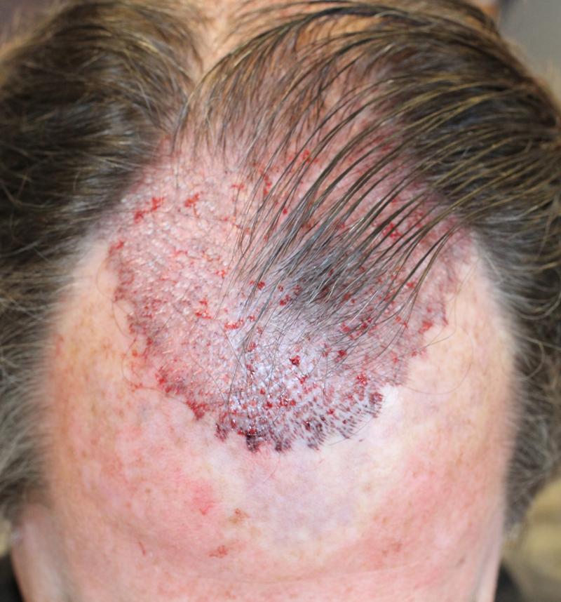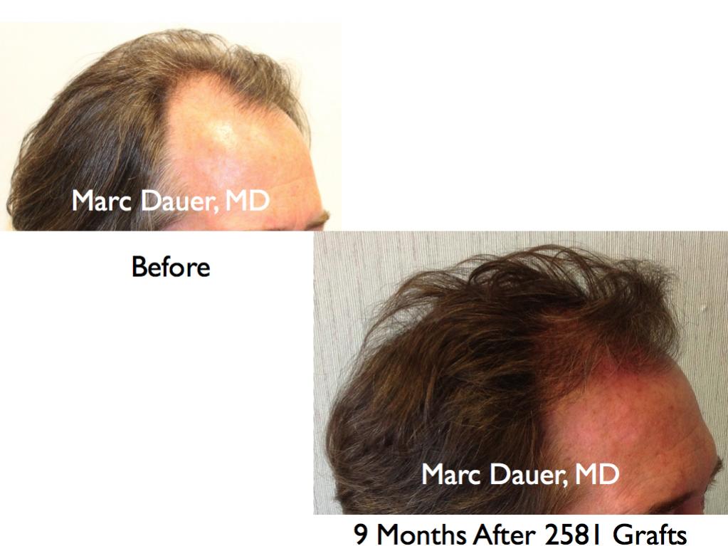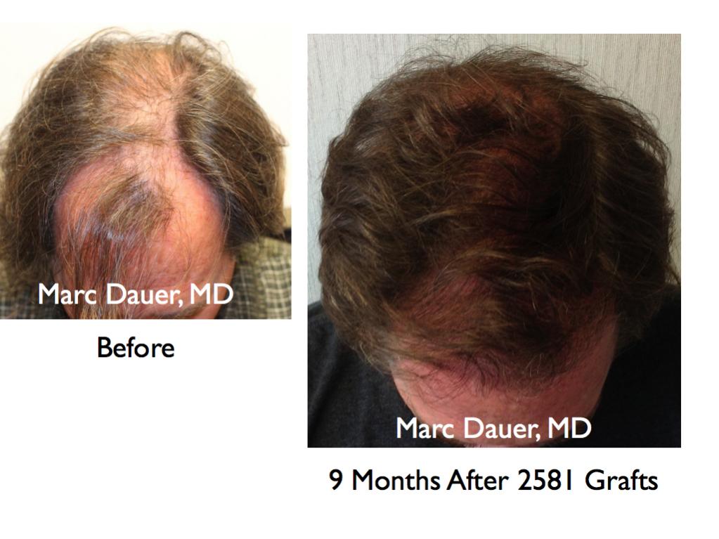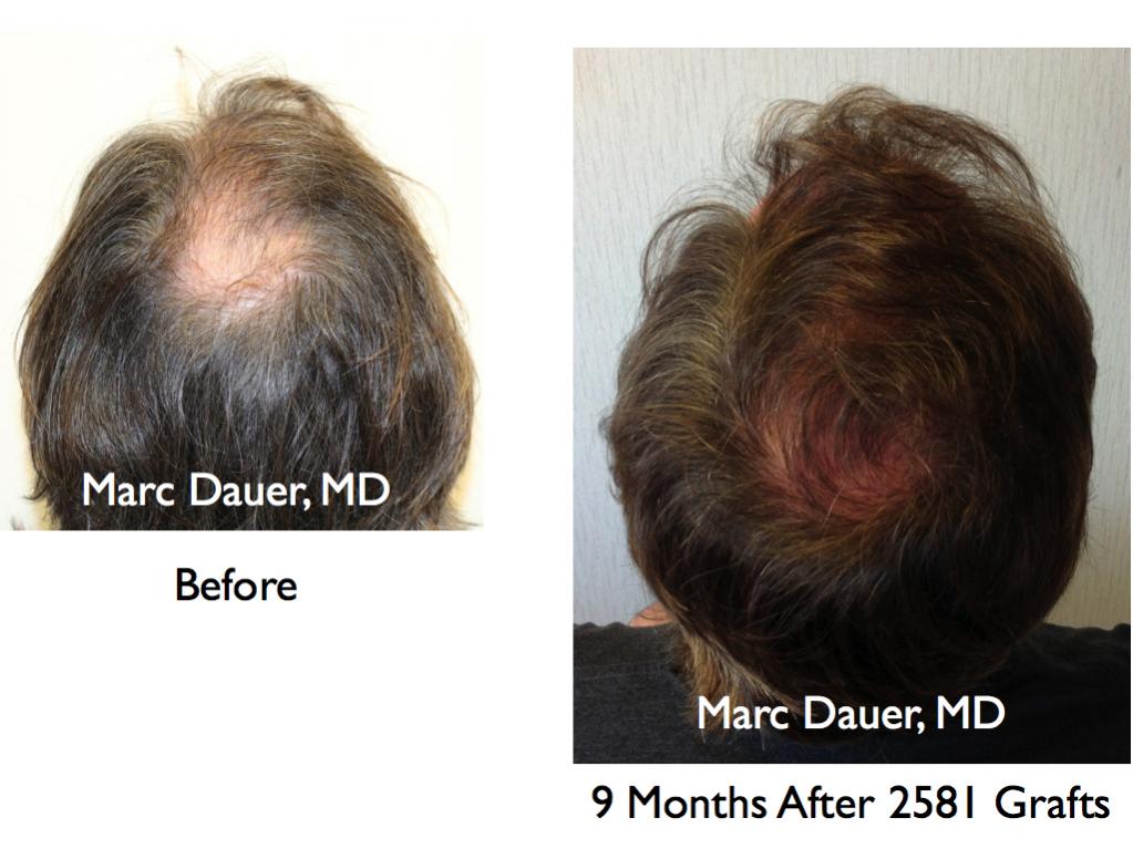 Here is a patient of mine 9 months after receiving 2581 grafts via FUT to the frontal scalp and crown. The patient has fine hair. He should see some additional cosmetic density over the next 4-5 months.