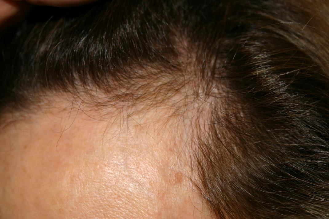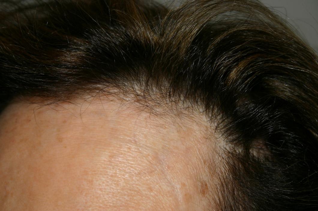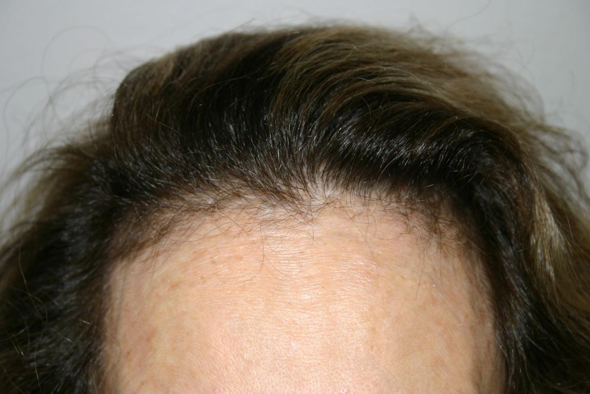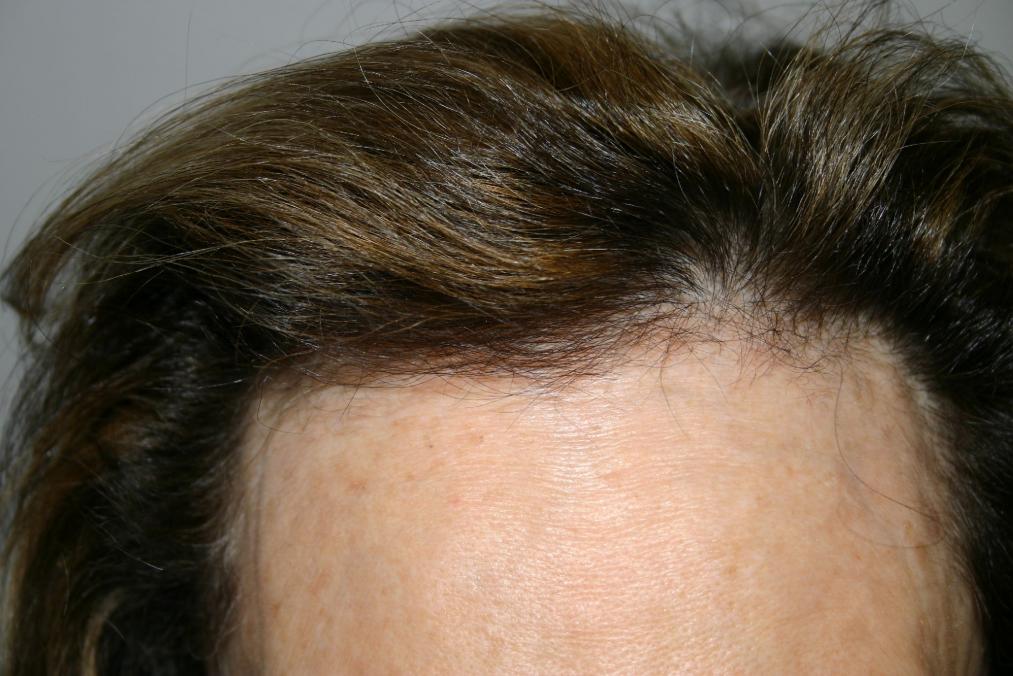 Her case was fairly straightforward with some miniaturized hair remaining in the temporal recessions and complete loss of side burns. Women hate these two problems because they do not feel they can wear their hair pulled back. So while not always obvious, it severely limits styling options.