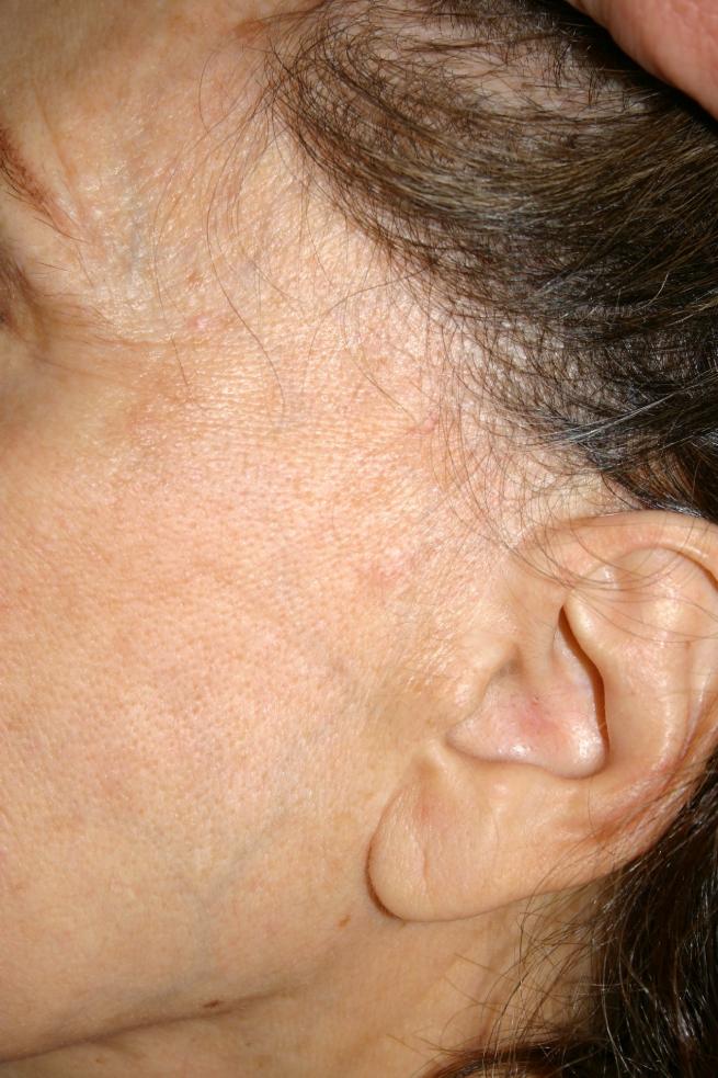 The case presented here represents both reasons why many women seek transplantation: deepening temporal recessions as a result of genetics and the loss of pre auricular hair (sideburns) as a result of a facelift.