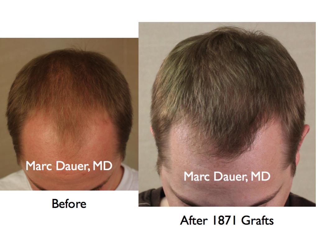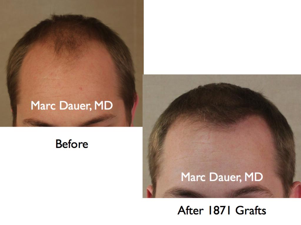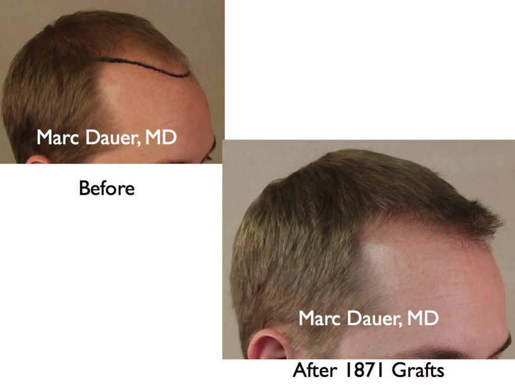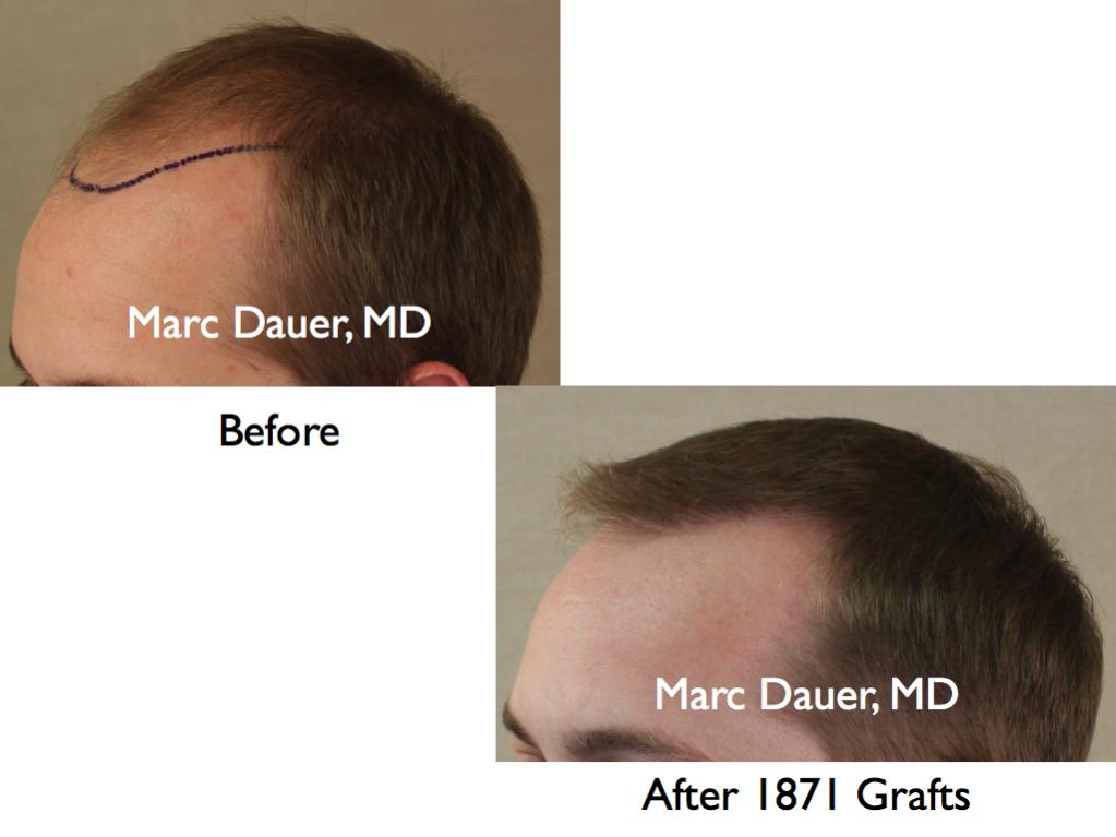 Here is a patient of mine who received 1871 grafts to the frontal and mid scalp via FUT and the results are shown at 8 months. The patient's hairline was placed in a conservative location because the patient is in his mid 20's and I wanted to conserve donor hair for future hair loss. The patient should see more cosmetic density over the next 4-6 months as the transplanted hair thickens in diameter.