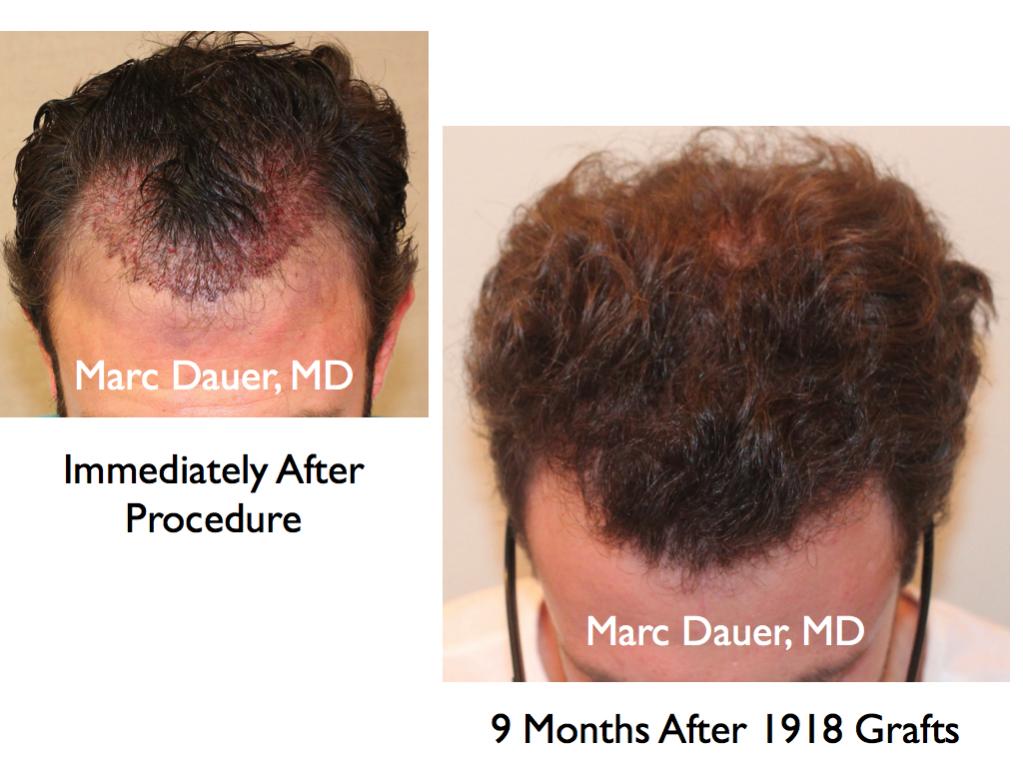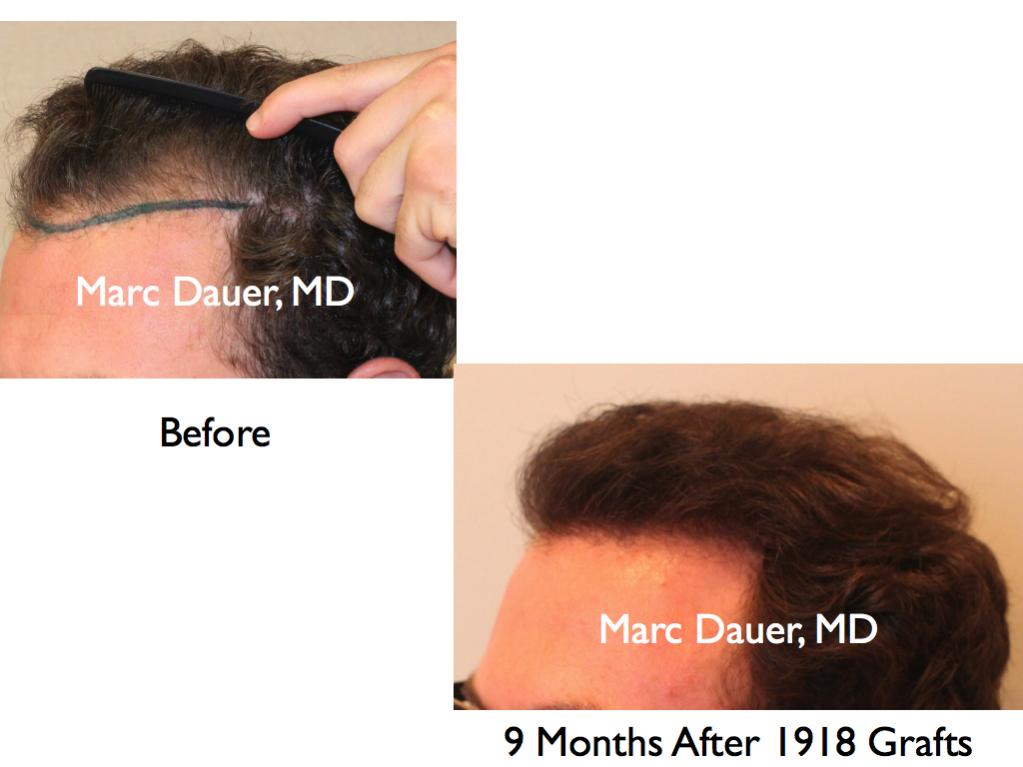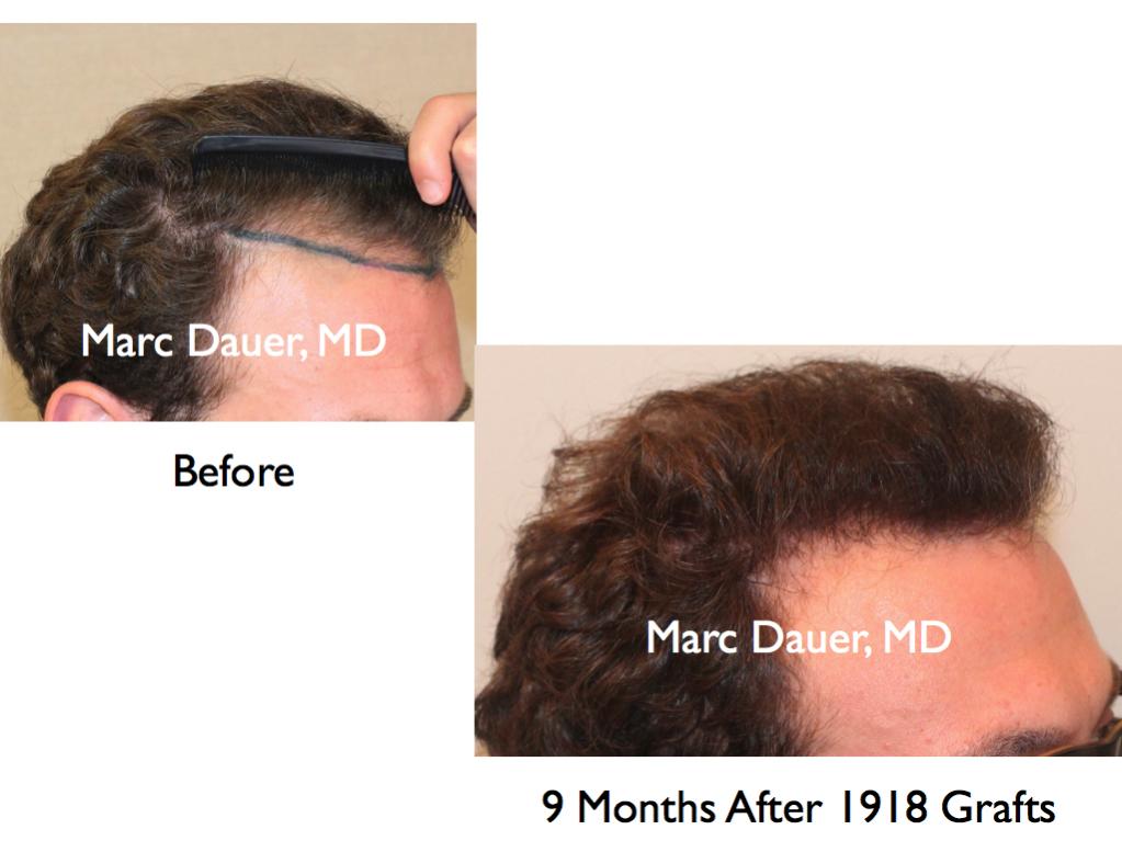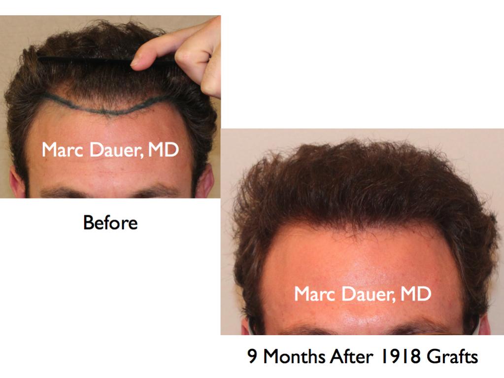 Here is a 29 year old male patient of mine who received 1918 grafts via FUT to build density in the frontal scalp. The results are shown after 9 months.