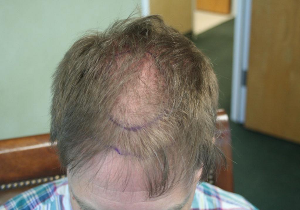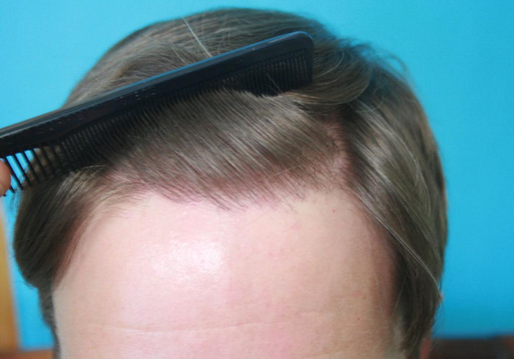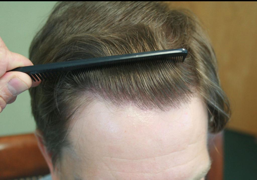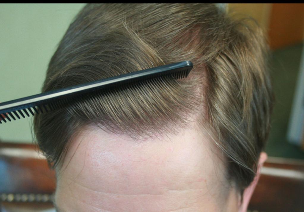 This patient was diffusely thinning through out the entire top of his scalp. He is 1 year out from the traditional strip method, where we transplanted 2857 Grafts, plus using Acell. Patient stated to me that before his hair became very thin, He would complain of styling problems due to the thick hair falling forward. Now he's over joyed to have those styling issues back again. Patient stated that his hair feels as thick as before.