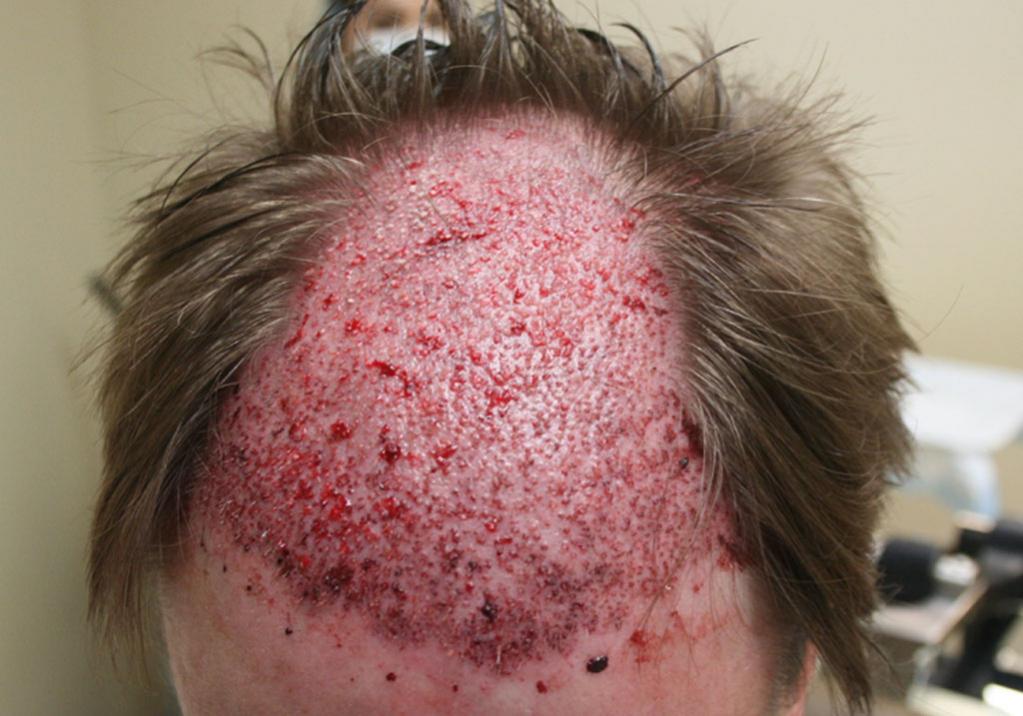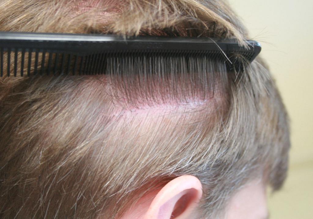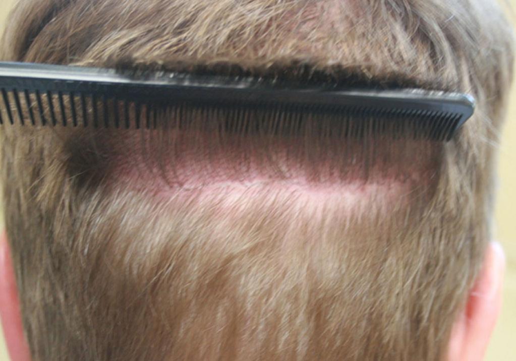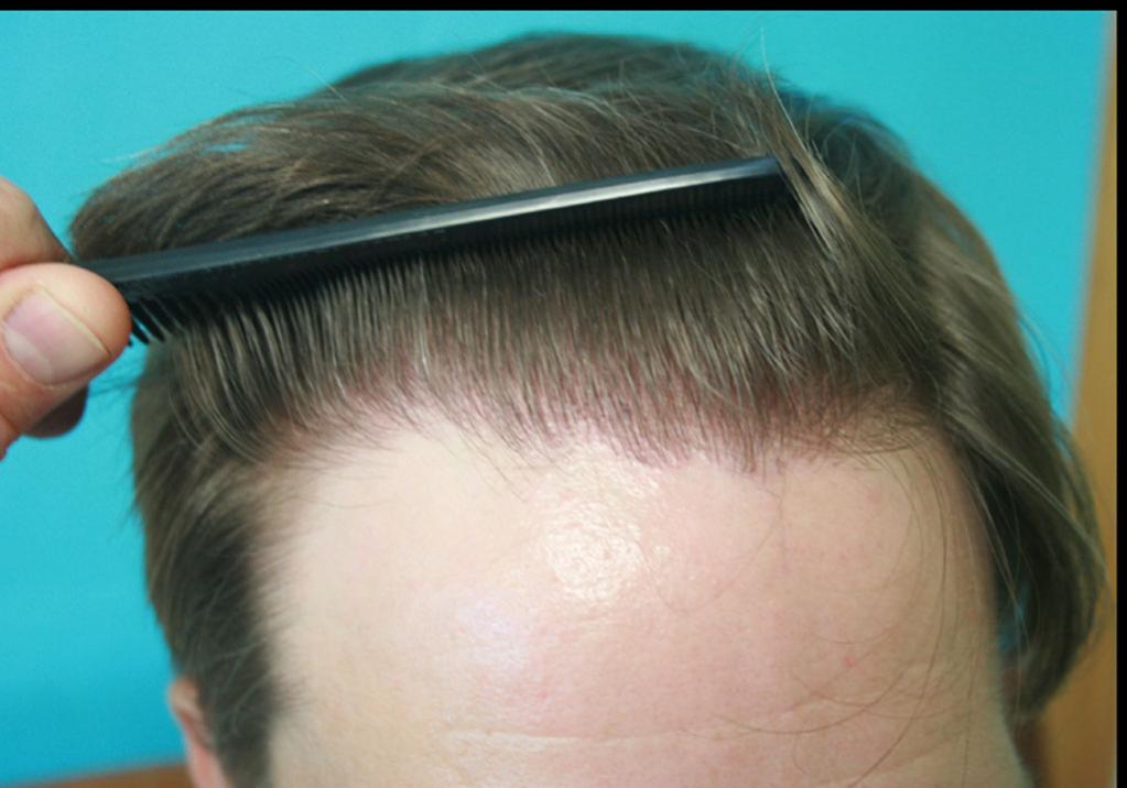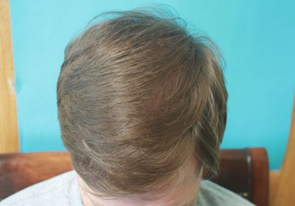 This patient was diffusely thinning through out the entire top of his scalp. He is 1 year out from the traditional strip method, where we transplanted 2857 Grafts, plus using Acell. Patient stated to me that before his hair became very thin, He would complain of styling problems due to the thick hair falling forward. Now he's over joyed to have those styling issues back again. Patient stated that his hair feels as thick as before.
