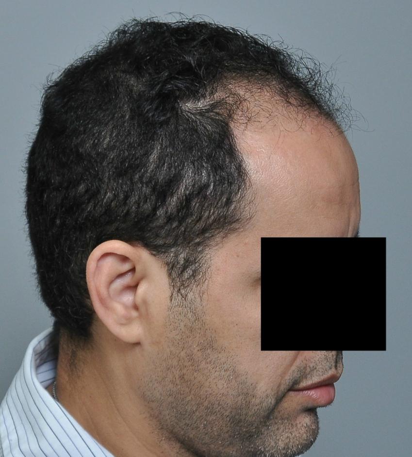 This patient has type IV loss and wanted frontal restoration. We did FUT of 3,042 grafts (1-1215, 2-1325, 3-502; 5,321 hairs). We also performed PRP/ACell to try to provide some overall thickening. He is shown at 9 months. Some comments: his hairs/graft were below average but the quality of his hair (caliber, curl) made up for this, providing nice coverage. There is mild thickening in the mid scalp and crown from the PRP despite the patient not being on finasteride (we recommended it, but he decided against it). He plans to do periodic PRP's to keep up with any future loss.