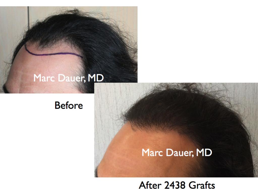 Here is a patient of mine who received 2438 grafts via FUT to lower the hairline and increase the density in the frontal and mid scalp. The results are shown at 12 months post procedure. Despite the fact that the patient has very fine hair the result is impressive and the patient is very happy.