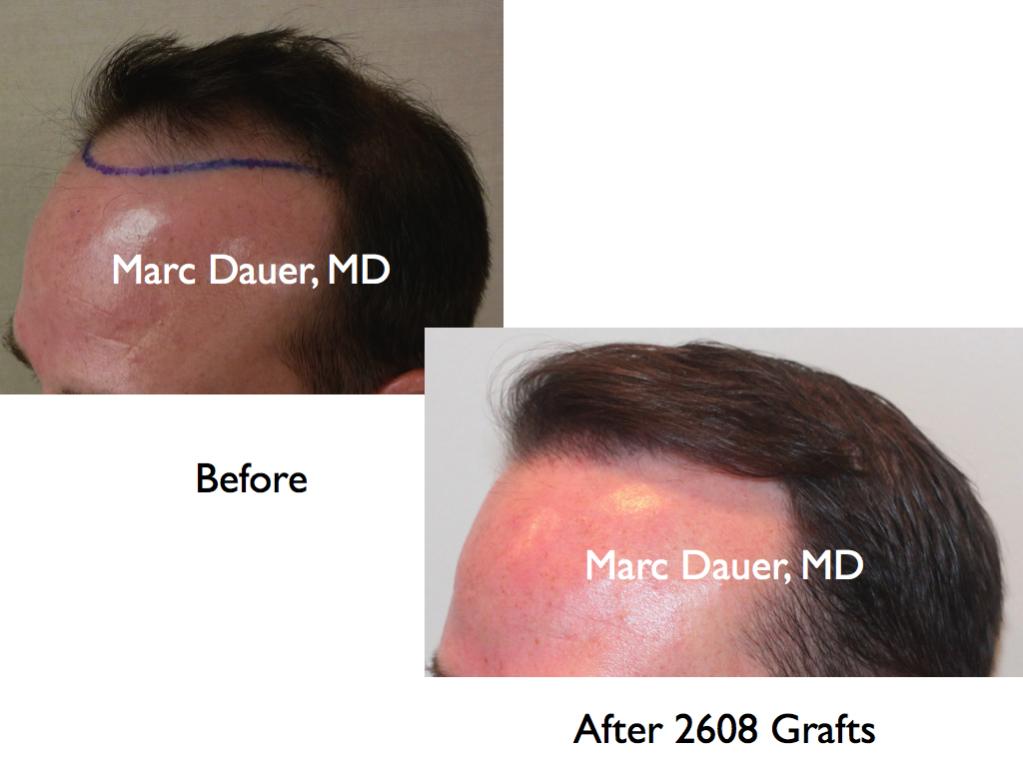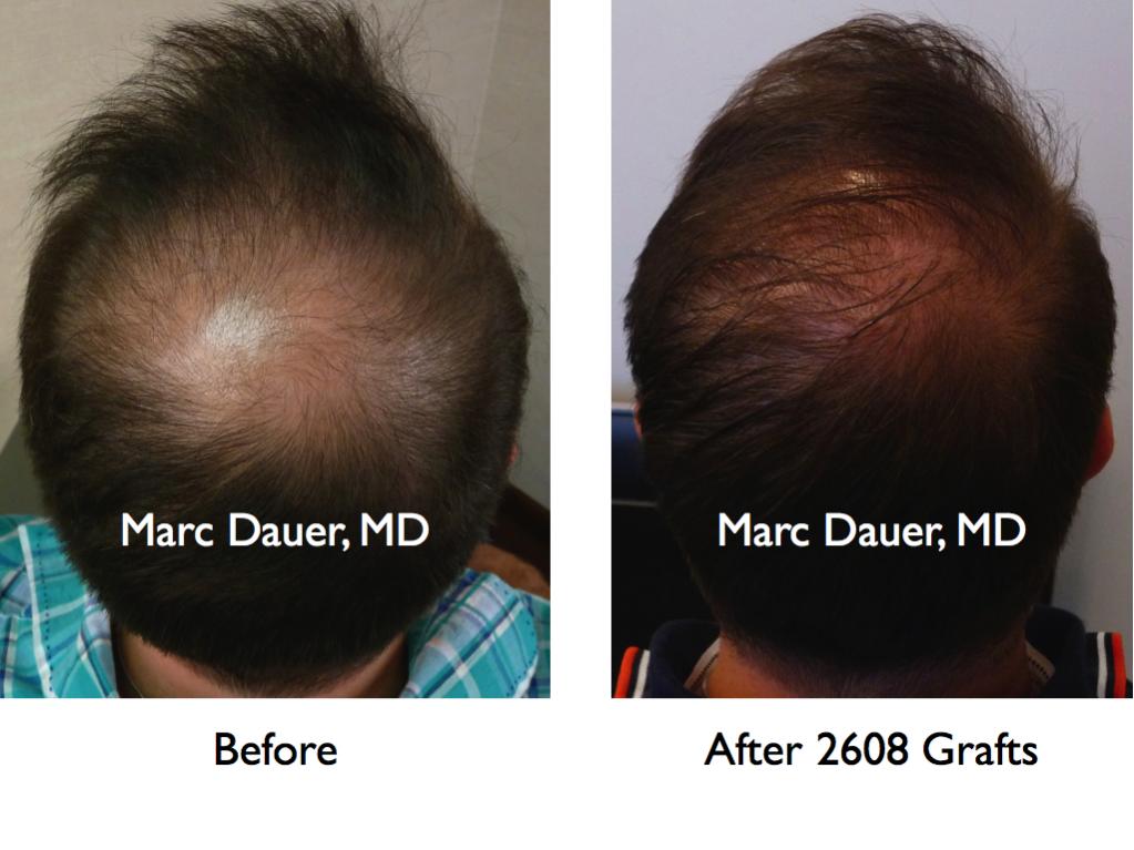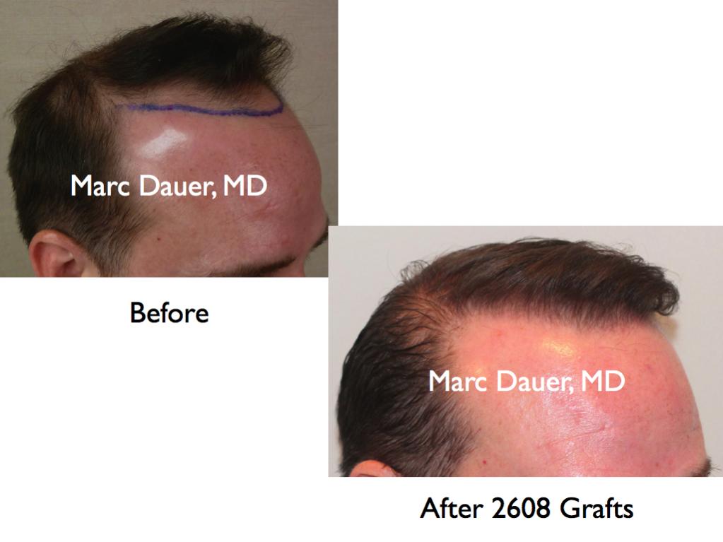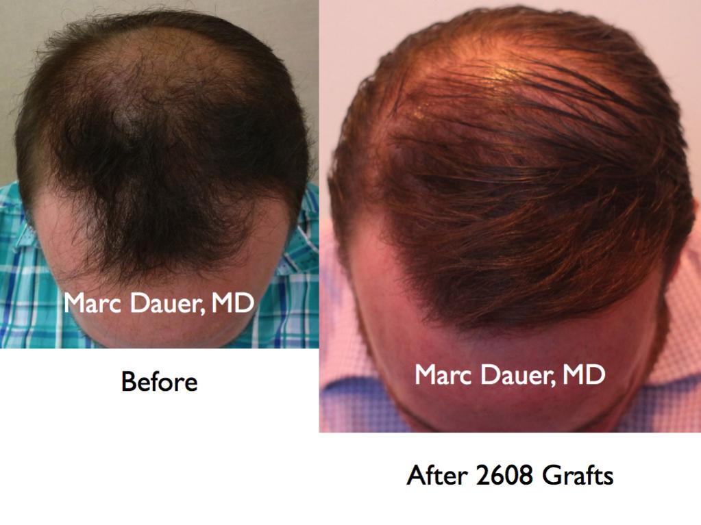 Here is a patient of mine who received 2608 grafts via FUT to the frontal scalp, mid scalp, and crown. About 75% of the grafts were placed in the frontal and mid scalp and 25% in the crown. The results are shown after 2 years. The patient came into the office with hair gel for the "after" photo which is why it looks a little wet. The gel also makes the hair look a little thinner than it would normal look without product. The patient is very happy with his current results. We will probably schedule a follow up procedure to add some density to the crown in the future.