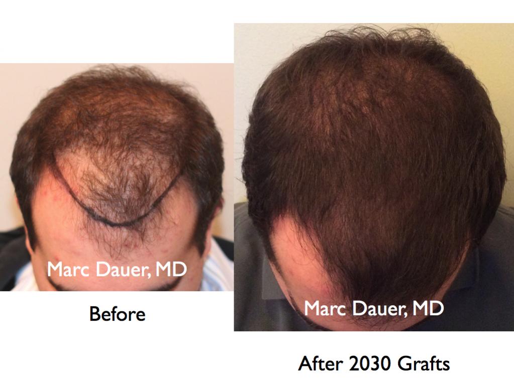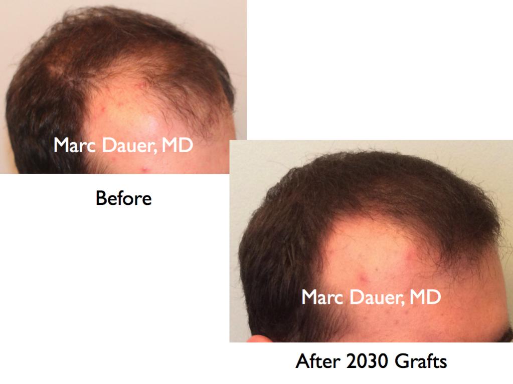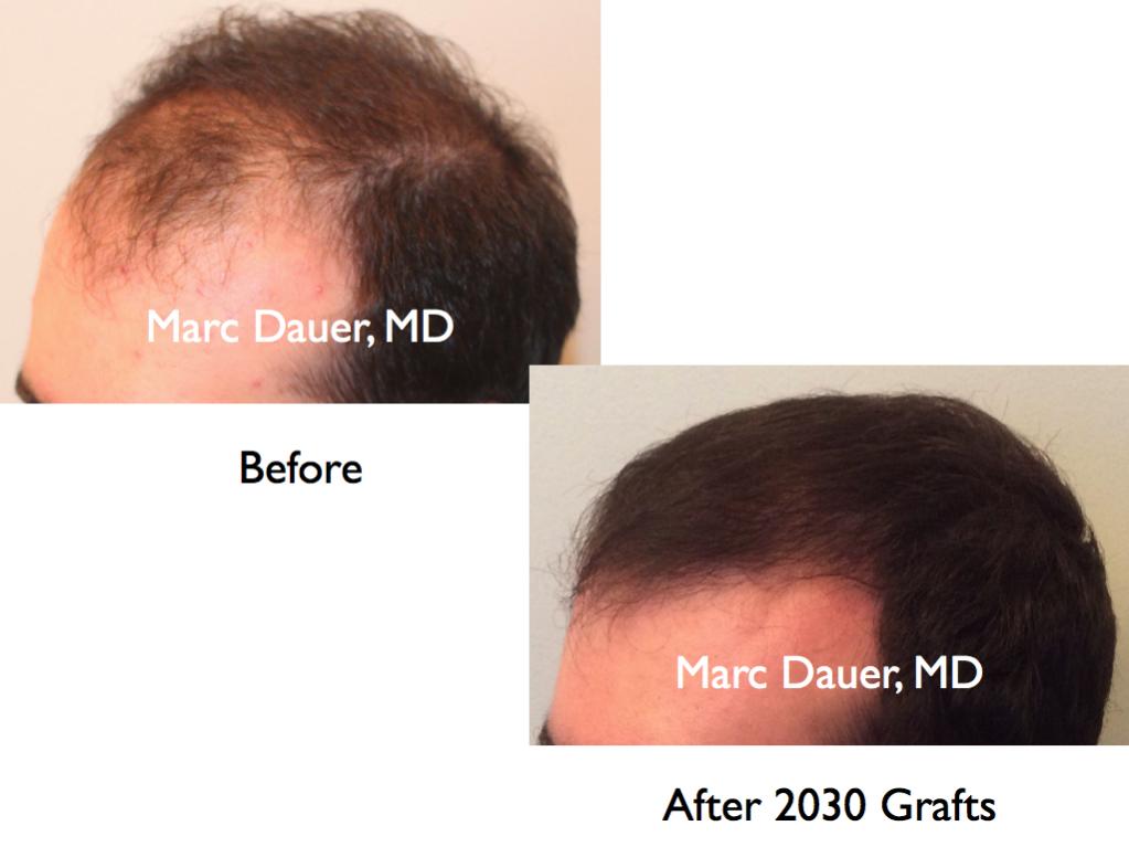 This patient of mine received 2080 grafts via FUT to the frontal and mid scalp. The results are shown after 9 months. The patient should see some increased cosmetic density over the next 3-6 months from thickening of the hair follicles.