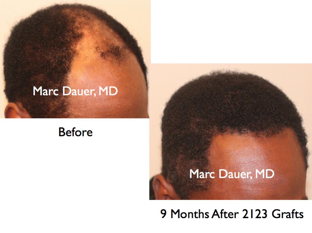 Here is a patient of mine who received 2123 grafts via FUT to the frontal and mid scalp. The character of his hair has given him amazing cosmetic density considering the graft count and amount of pre procedure hair loss.