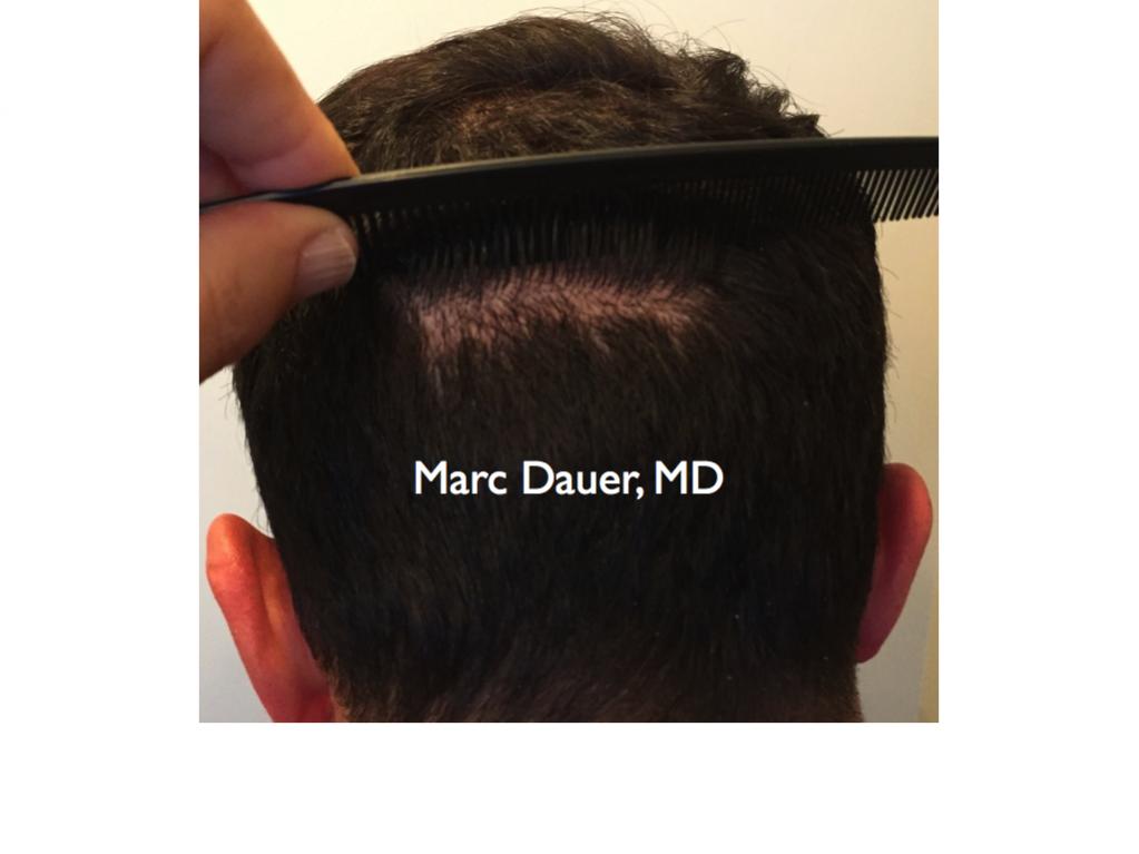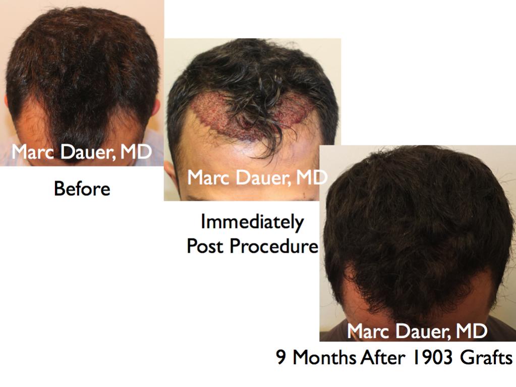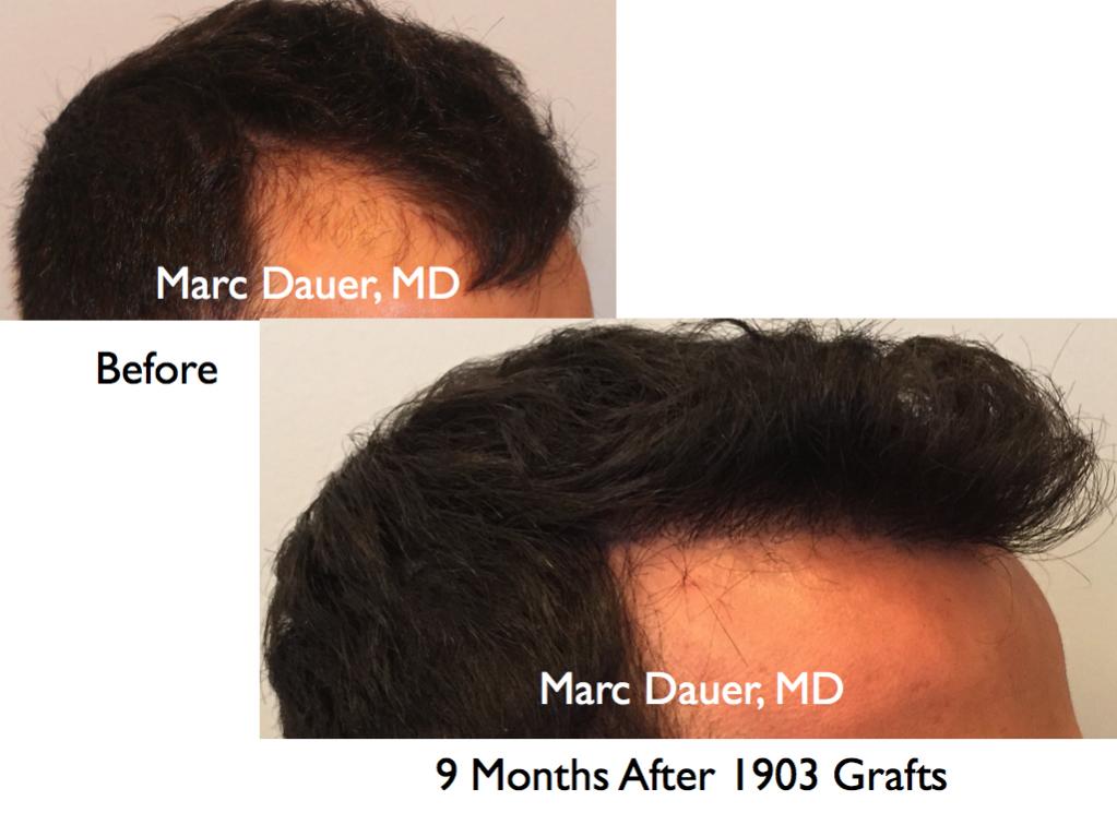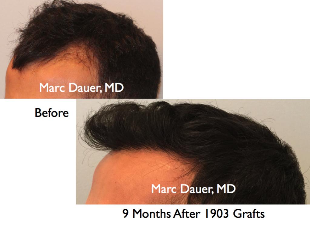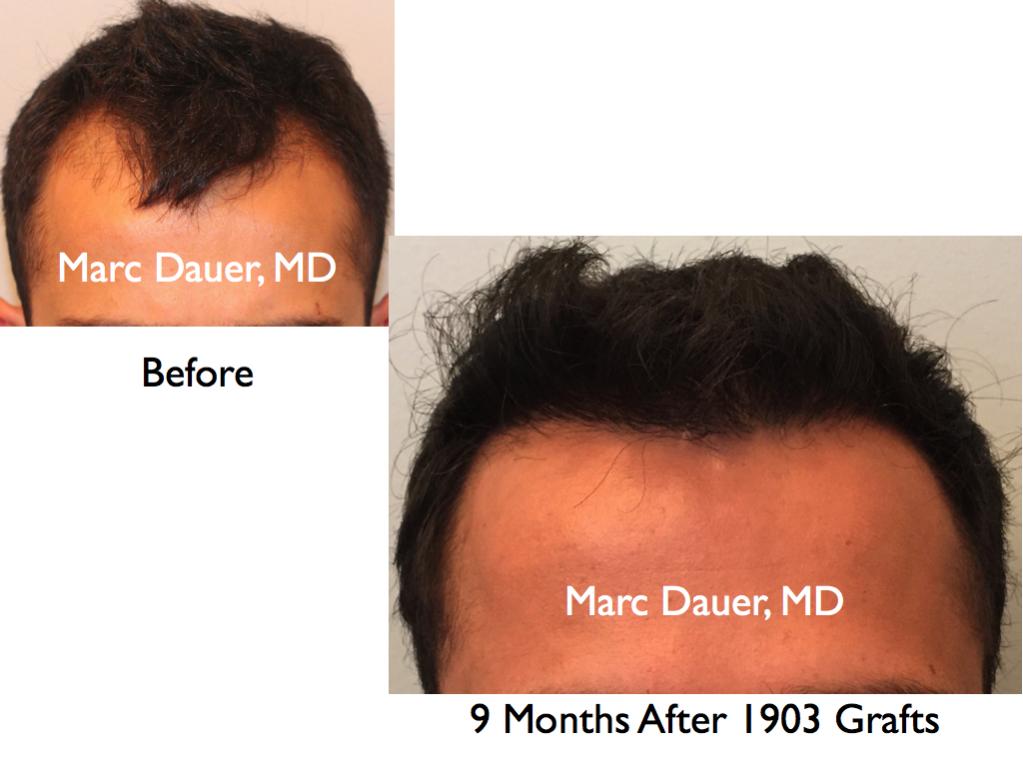Here is a patient of mine who received 1902 grafts via FUT to the frontal scalp 9 months ago. The patient should see some increased density over the next 3-5 months as the follicles thicken but he is already thrilled with his results.