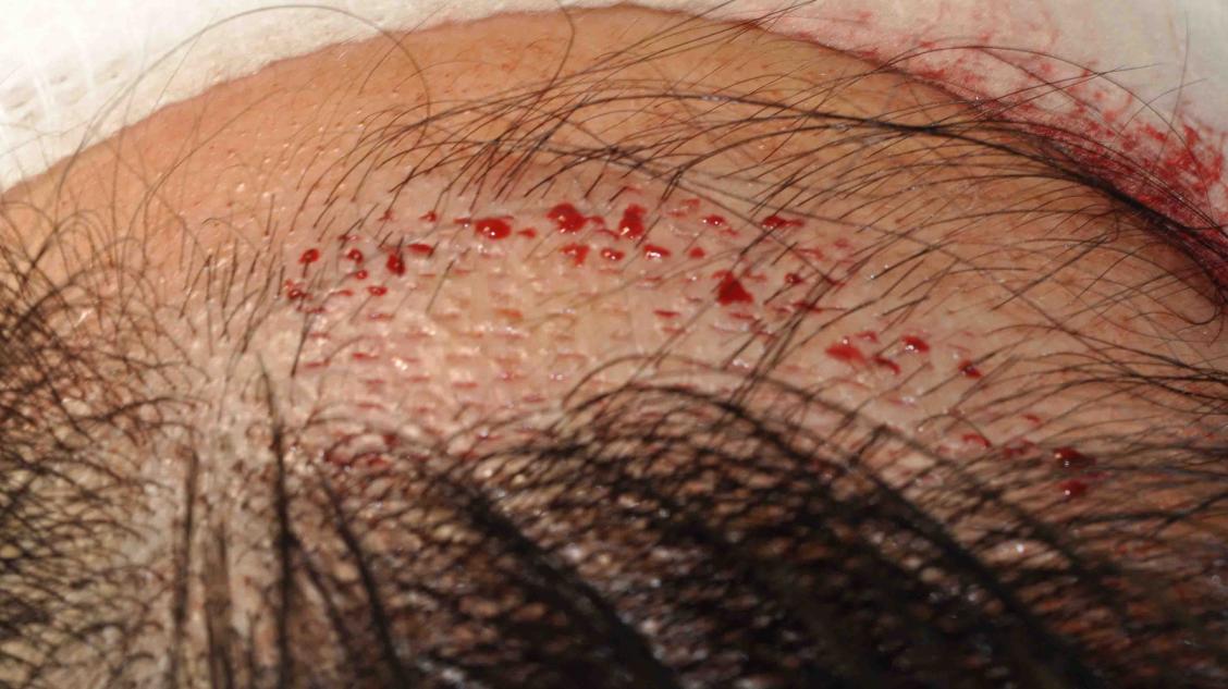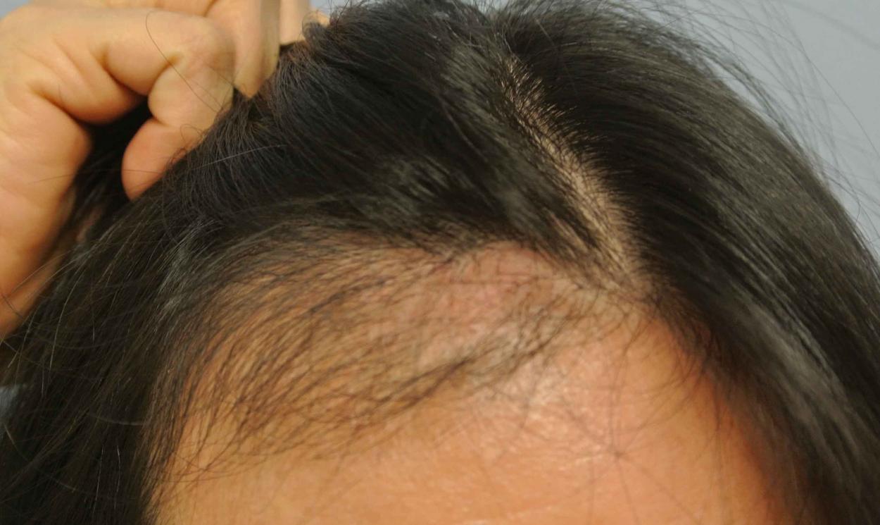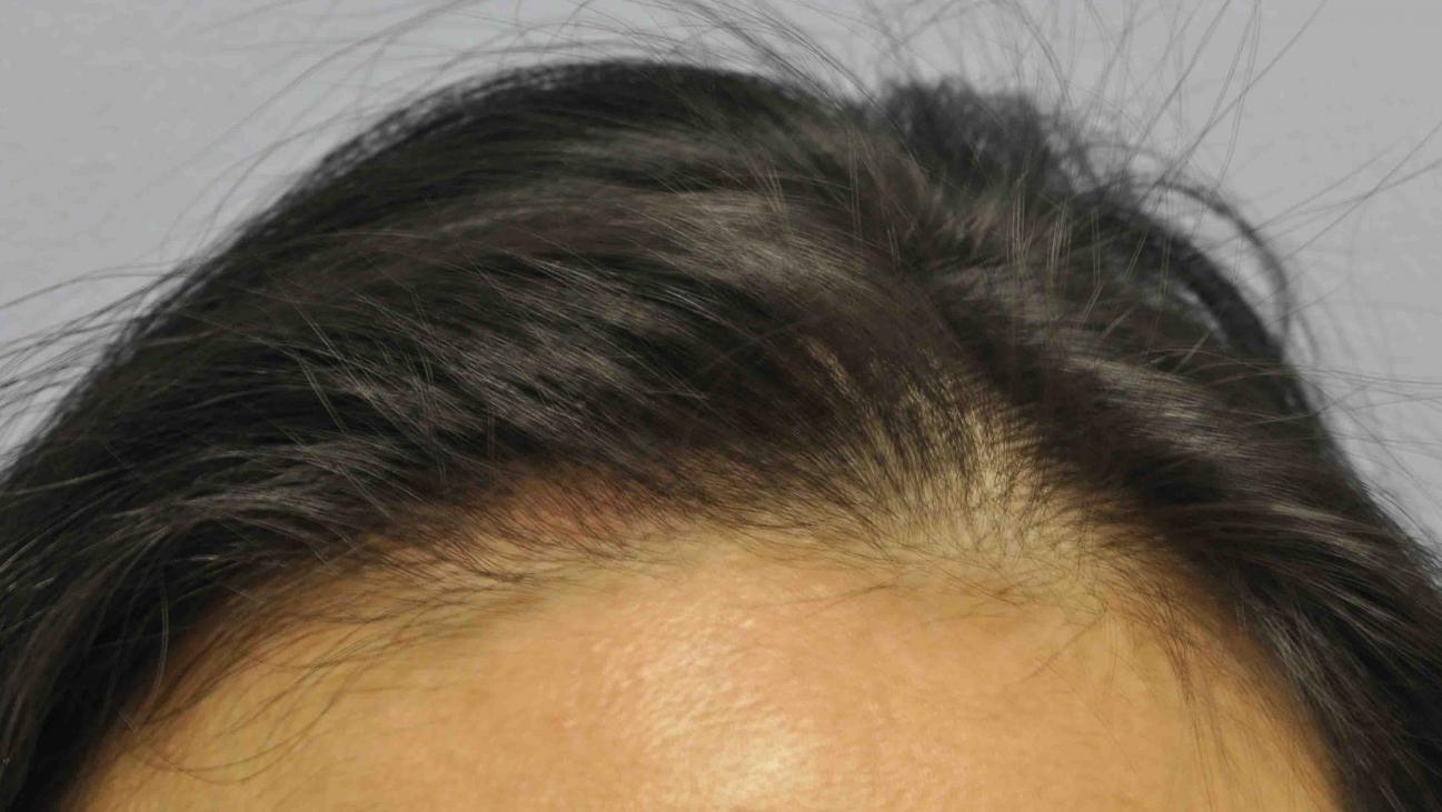 This nice lady was burned as a child. She had a 1.5 x 1.5 inch atrophic hairless hypopigmented burn scar on her forehead.