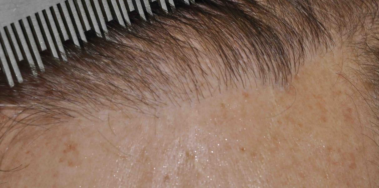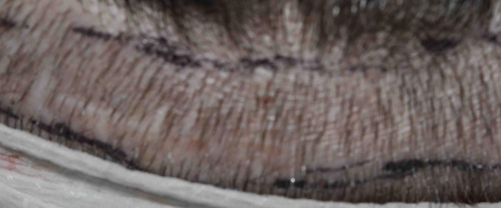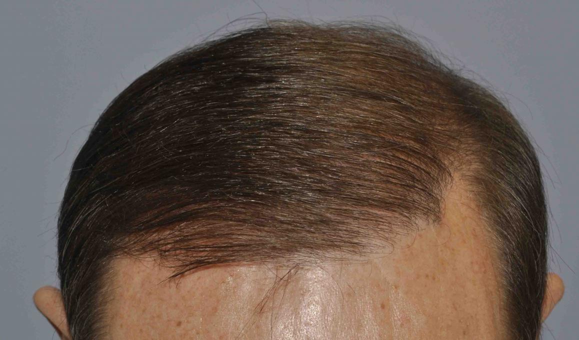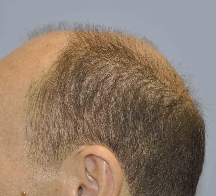 Shown are selected preop, first case, second case and final pics. Of particular attention are his first strip scar, which was excised in the middle of his strip for the second case…almost imperceptible, and his final scar which is pretty good..but not imperceptible. Also, we added about 300 singles to his left frontal hairline to strengthen it at the second case.