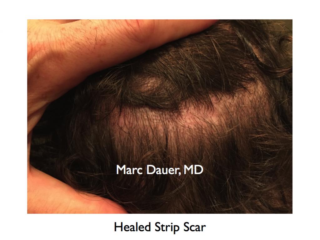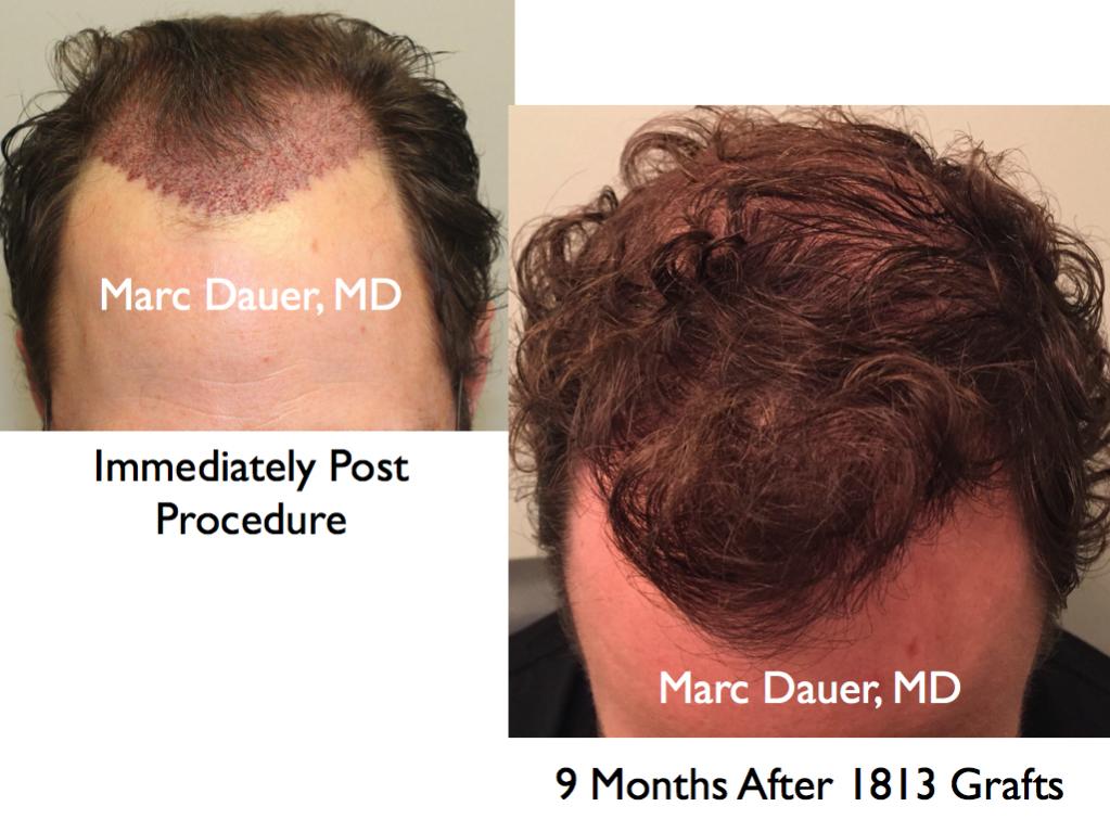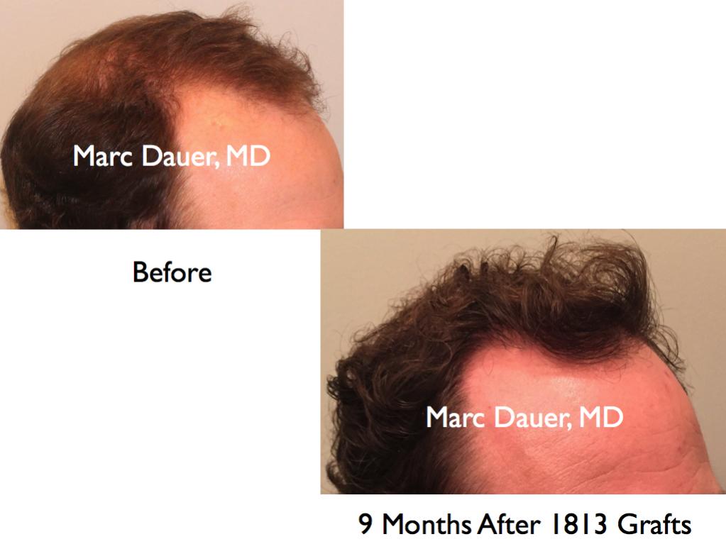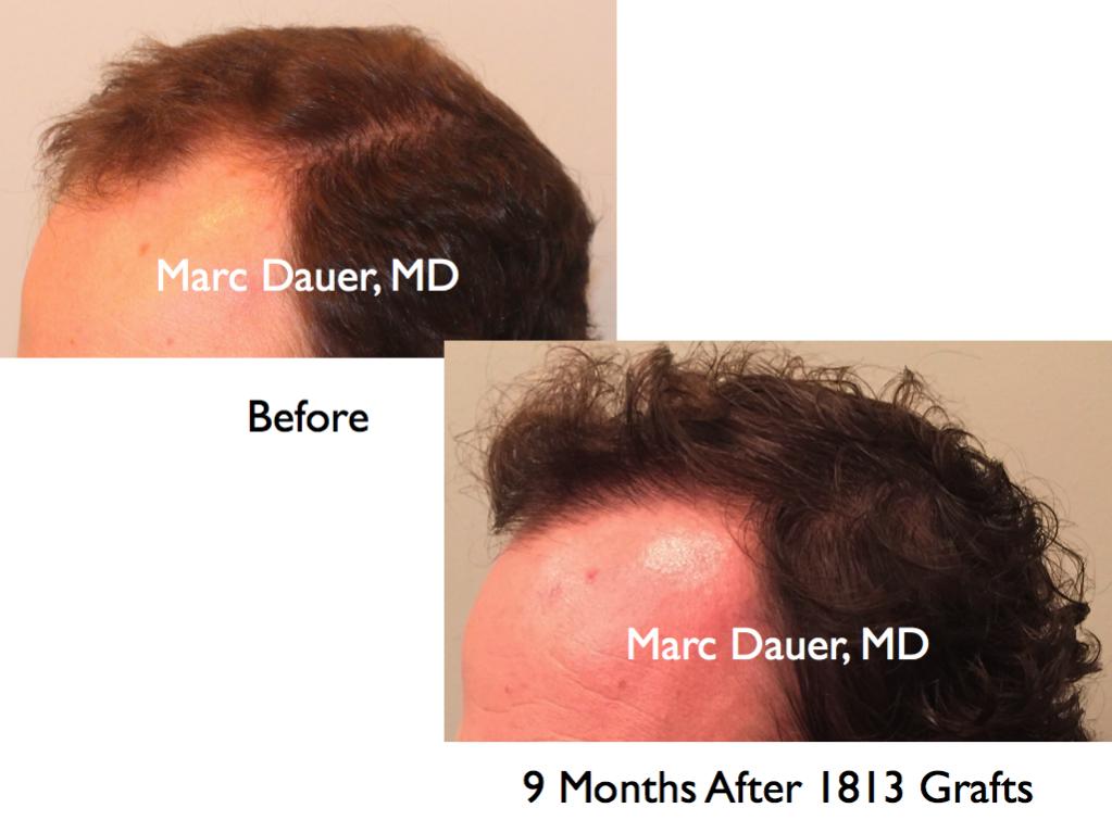 Here is a patient of mine who received 1813 grafts via FUT 9 months ago to the frontal and mid scalp. The results are shown after 9 months so there will be some additional density achieved as the hair thickens over the next 3-6 months. Also the patient come into my office out of the rain so his hair was wet, which makes the hair look even thinner, but despite this there is a very nice post procedure change visualized and the patient is very happy with his results.