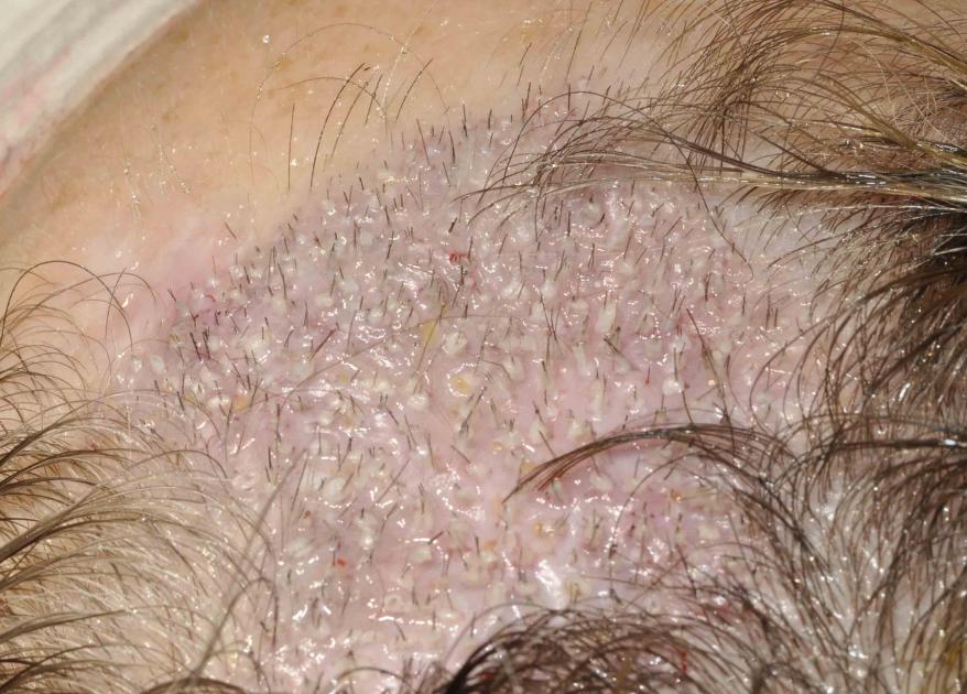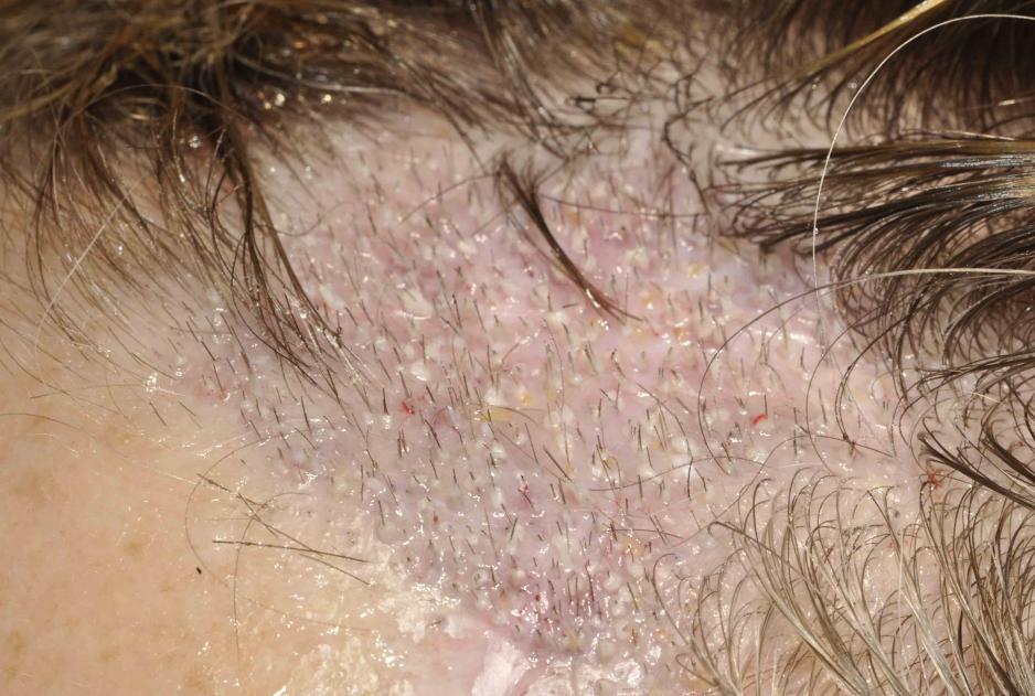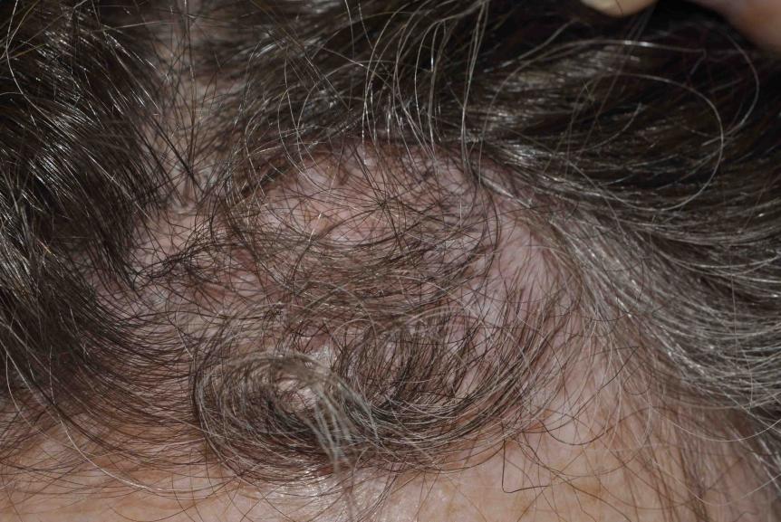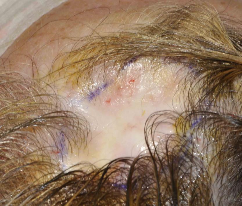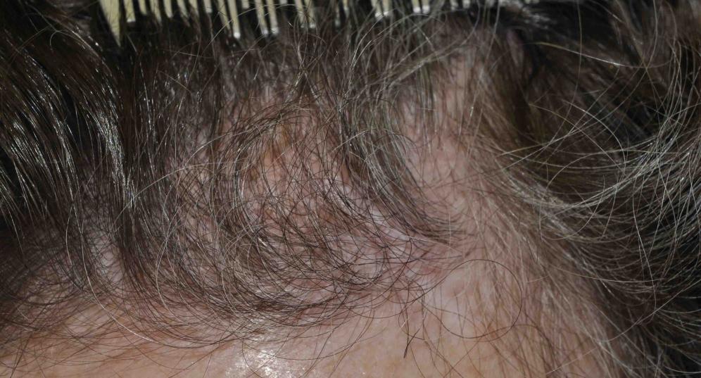This nice lady had a couple of skin cancers removed by Mohs technique by a local dermatologist. Because of the aggressiveness of her skin cancers, a skin graft was placed and part of this failed...and she was left with a fair sized hairless patch just behind her hairline. At a year out from her skin graft we placed hair and she just stopped by for a 6 month checkup.