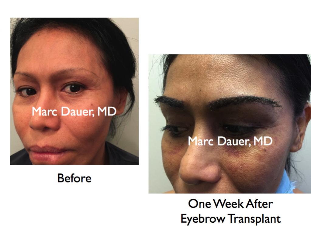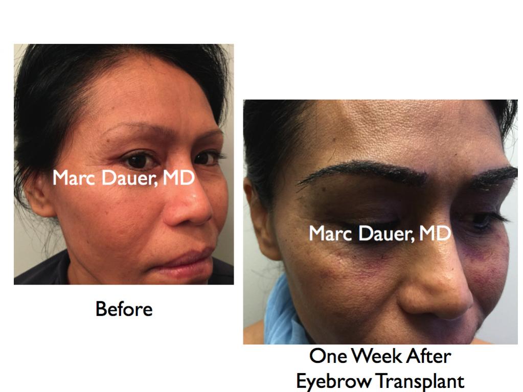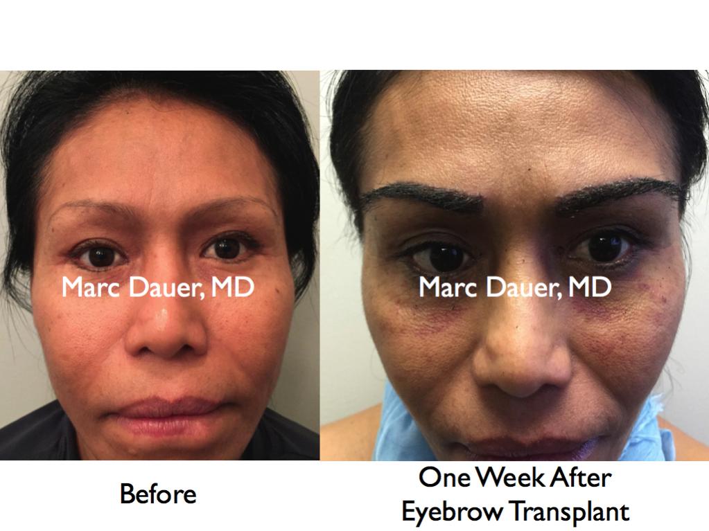 Here is a patient of mine 1 week after receiving approximately 350 hairs per eyebrow. The redness on her face is because of a chemical peel performed by another physician and has nothing to do with the eyebrow transplant. The "after" photo is a good indicator of approximately how the eyebrows will look after they grow back in.