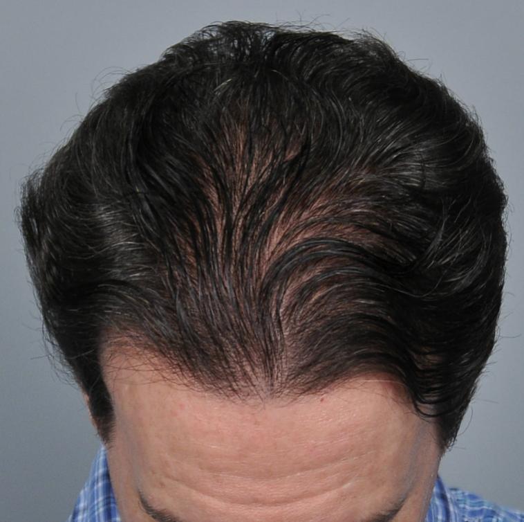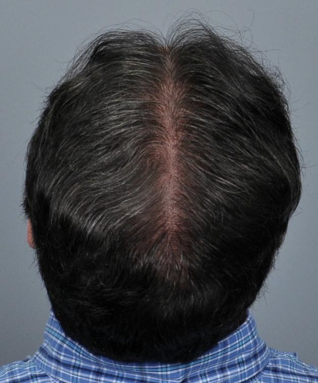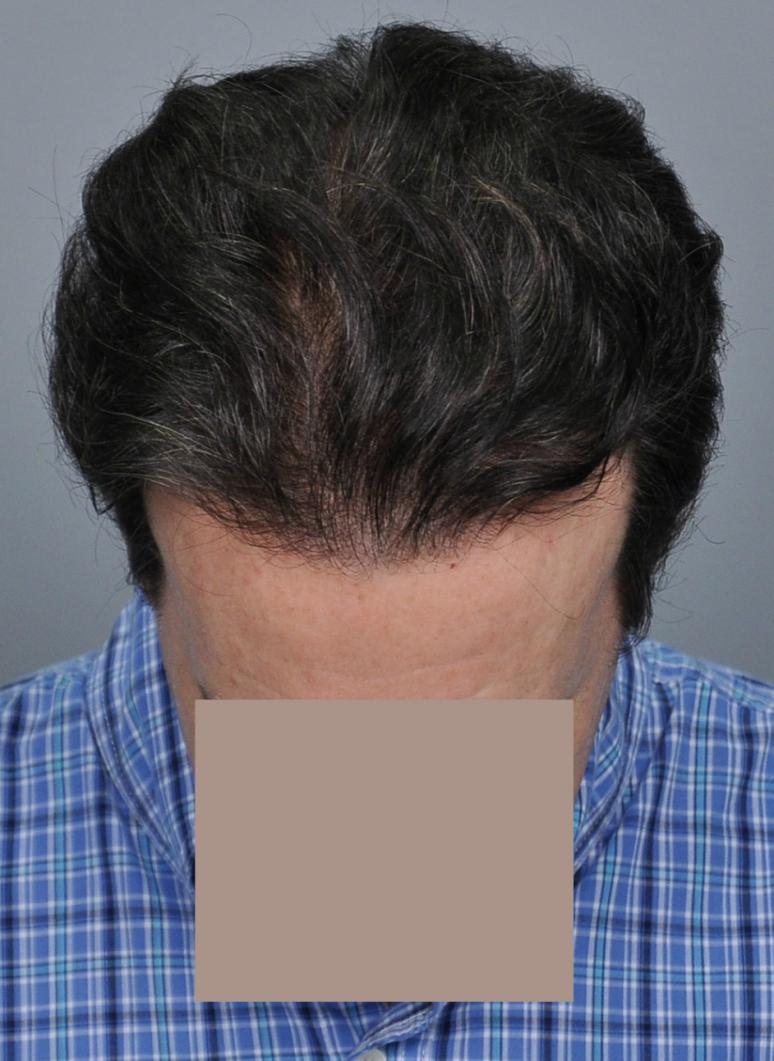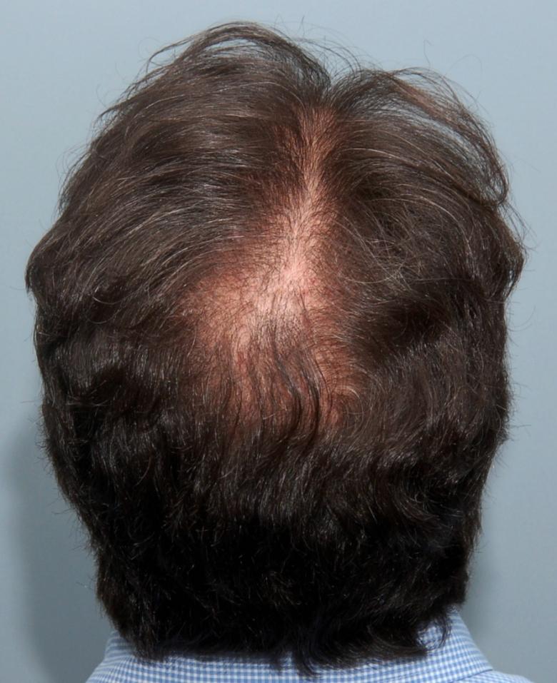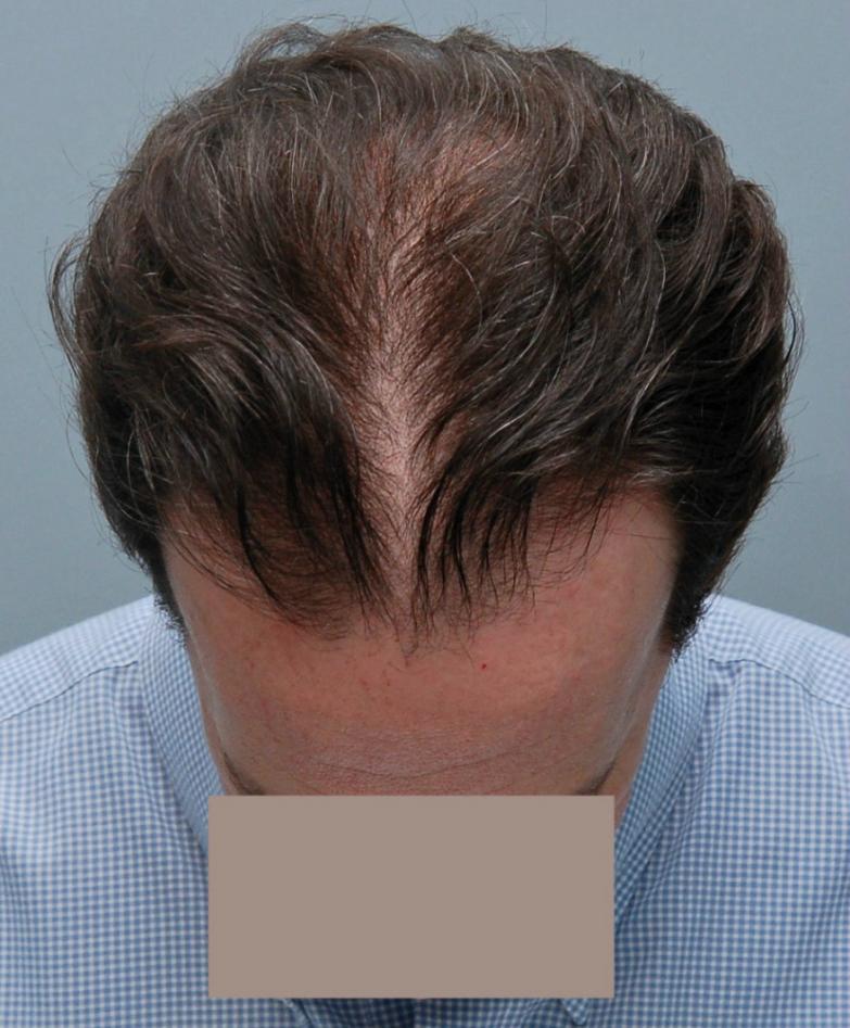 This patient is in his mid-40s and wanted to address his hairline and fill in the rest of the scalp. We started him on finasteride and performed FUT of 3,933 grafts (7,275 hairs, 1.85 hairs/graft). He didn't return until 5 years later. Overall, he was very pleased but noted that he thought his hair looked thicker a couple years prior (ie 3 years after the procedure). I explained that the grafts were not thinning but that he was seeing the natural progression while on finasteride. I see this all the time, and unfortunately patients sometimes think this means the medicine has 'stopped working'. Referring to the chart, the 'average' patient who starts finasteride will see thickening for about 5 years and then will begin to decline below where they started, but they are always much better than if they had never taken it, the difference becoming greater with every year. Options at this point include: adding minoxidil (if they are not already using it), doing another transplant, and/or doing a PRP/ACell procedure to regain some of the thickening. It is important to have an understanding of this process to set realistic expectations and make a long term plan.