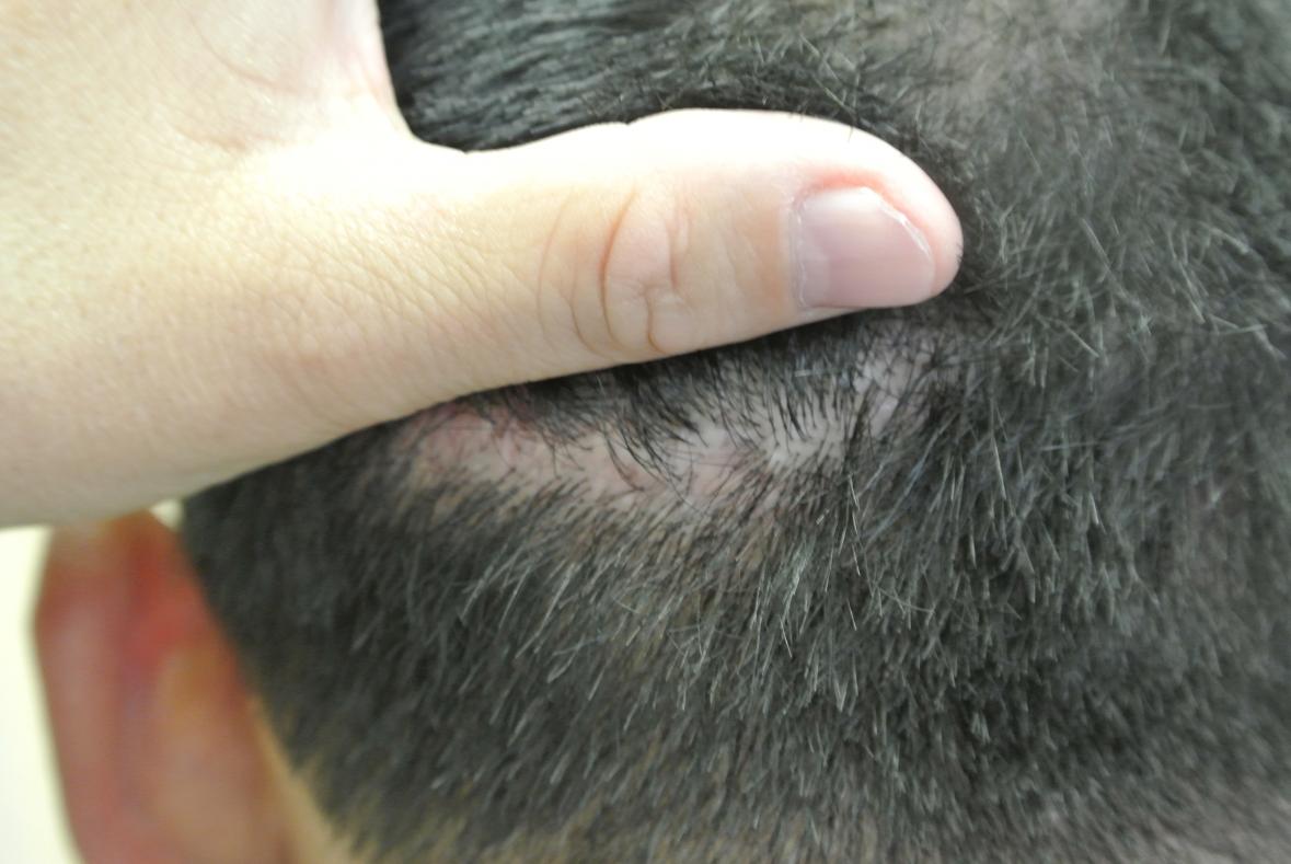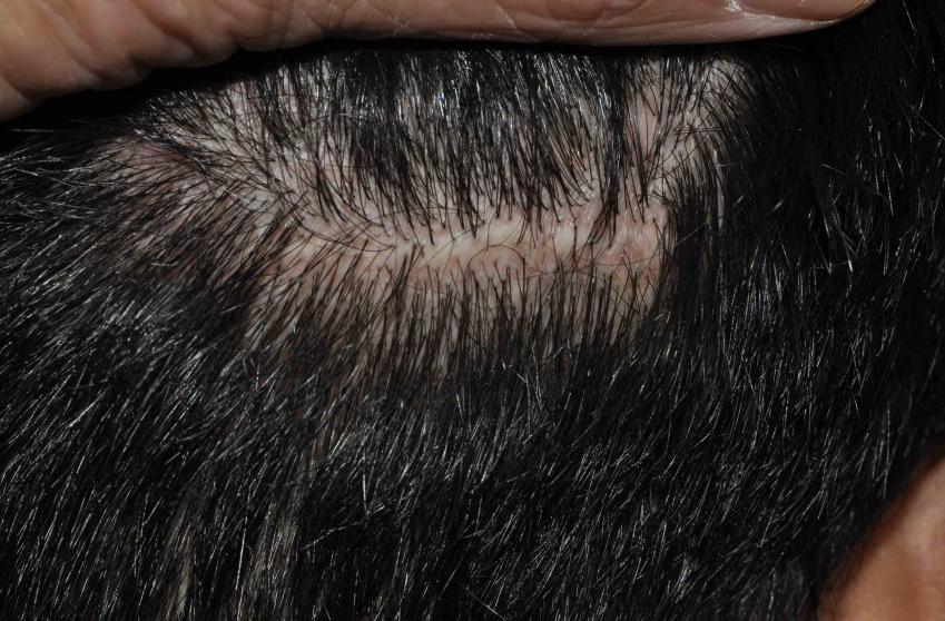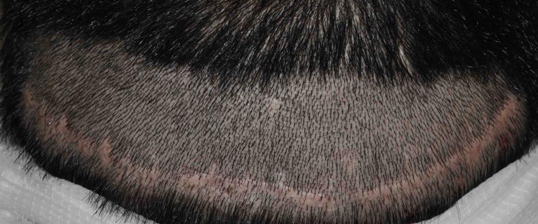 This nice man had a significant strip scar issue. He sought automated fue repair at a local clinic which was not successful other than leaving lots of medium sized punch scars, which you can see around his strip scar in the pictures.