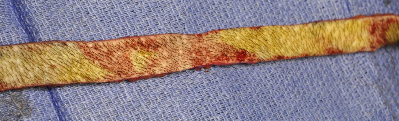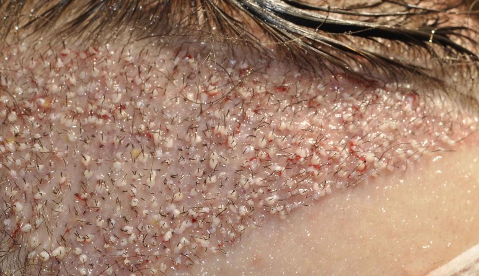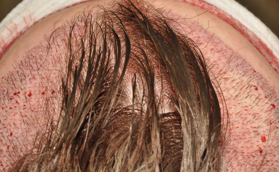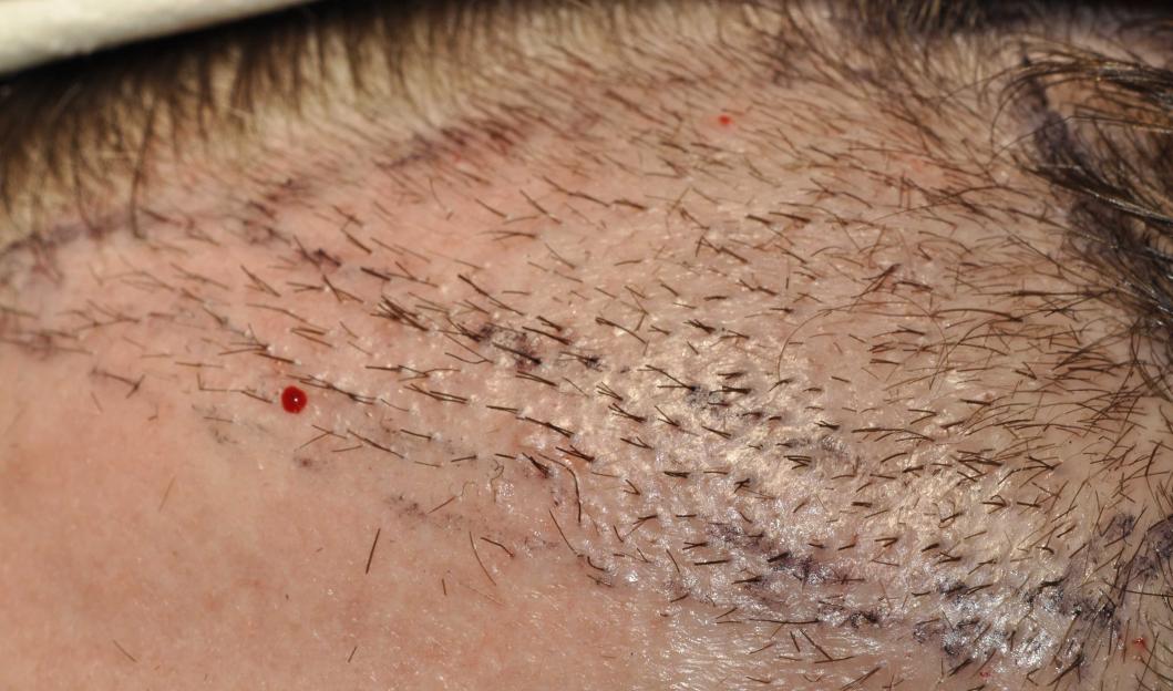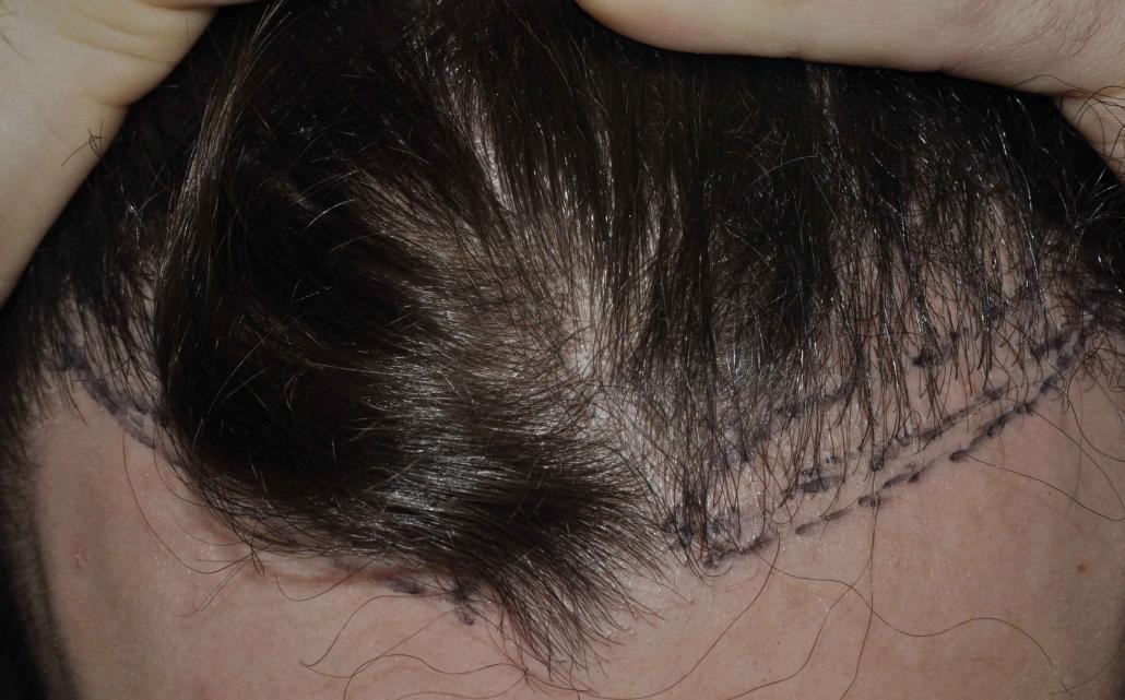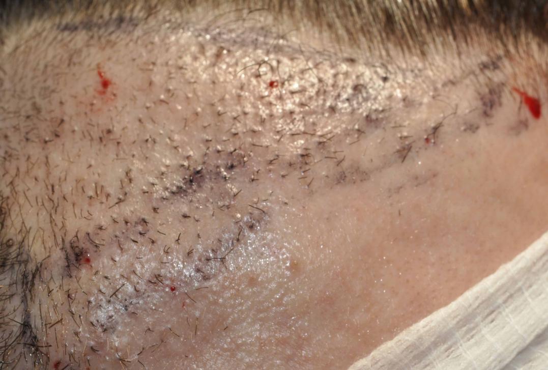Shown are intra-op pics. Notice how few tranplanted hairs appear to be in his original treatment area. Also, see the fairly large depigmented white scars in his excised donor strip. Lastly note that when we made the new recipient slits, I attempt to get as close to the hairs that he's already paid for elsewhere that I can. Finally, even though we shaved off those preexisting transplanted hairs, he is pretty tightly packed at the end of the case.