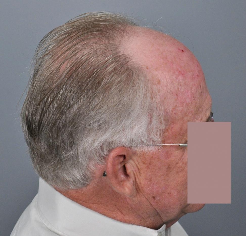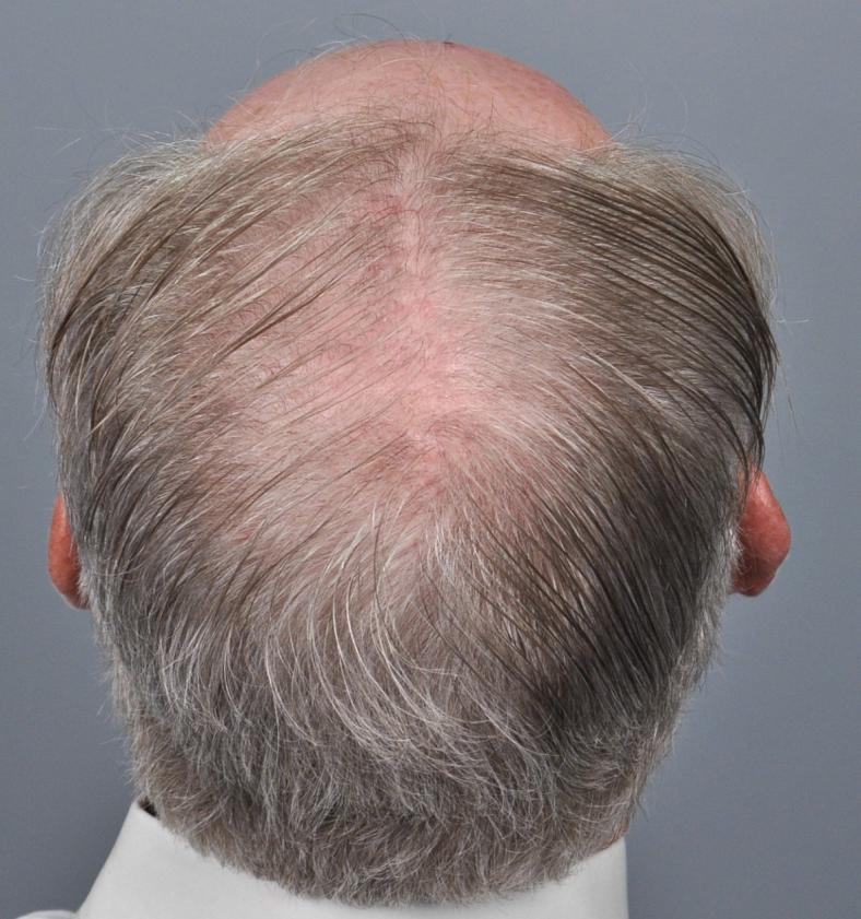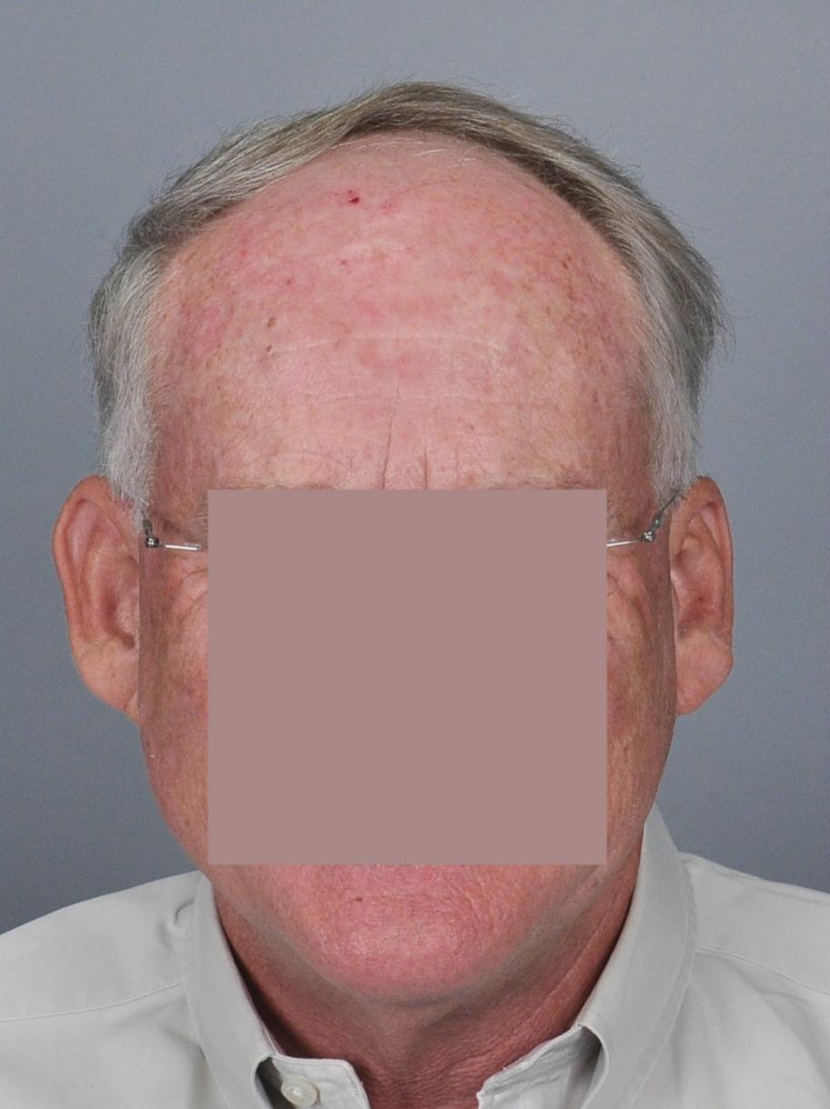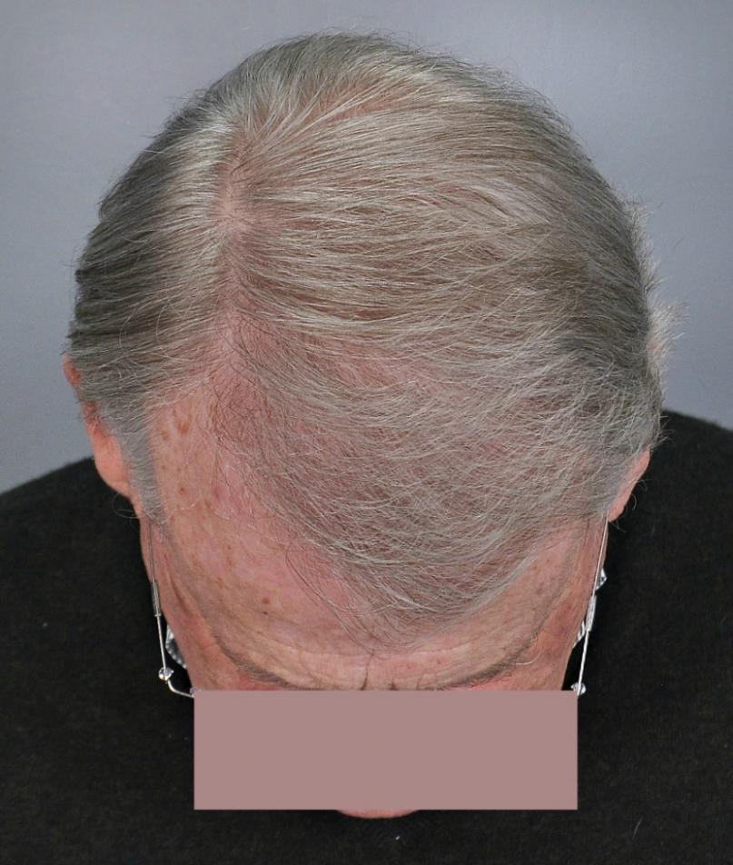 This patient is in his mid 60's and wanted to restore his frontal hair, as well as thicken the crown. We started finasteride and performed FUT: 3,801 grafts (1-779, 2-1626, 3-1010, 4-386; 8,605 hairs), placing mostly in the front but also some in the mid scalp and crown. He is shown 10 months post op. In patients with gray/white hair, we dye the hair to make dissection and placement easier.