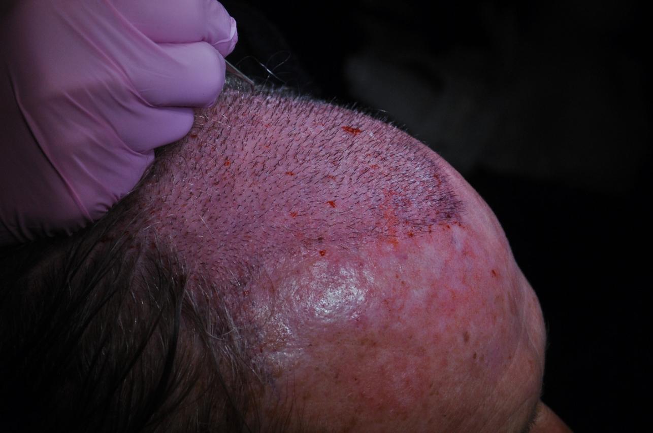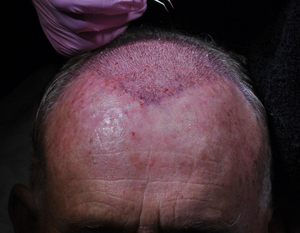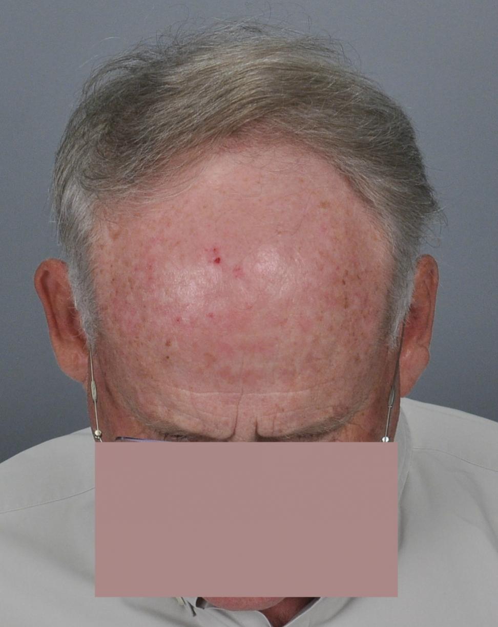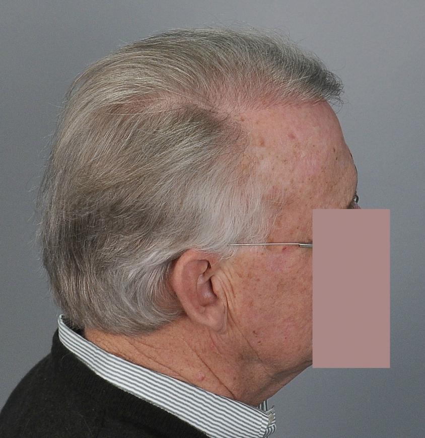 This patient is in his mid 60's and wanted to restore his frontal hair, as well as thicken the crown. We started finasteride and performed FUT: 3,801 grafts (1-779, 2-1626, 3-1010, 4-386; 8,605 hairs), placing mostly in the front but also some in the mid scalp and crown. He is shown 10 months post op. In patients with gray/white hair, we dye the hair to make dissection and placement easier.