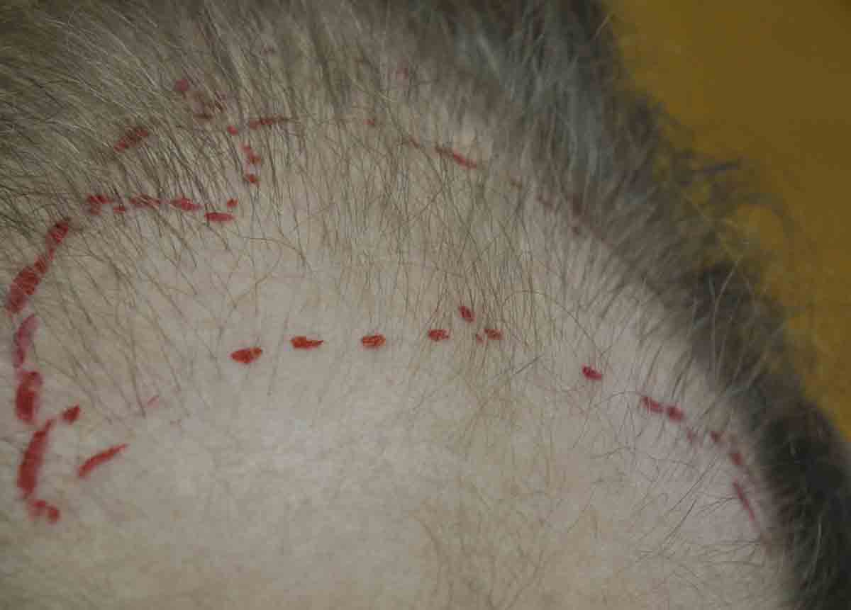 This nice fellow had had 5 previous strip cases and wanted to address bald scalp posterior to his previous cases, and to try and improve some of the non parallel and intersecting scars from multiple different surgical adventures with multiple different docs.