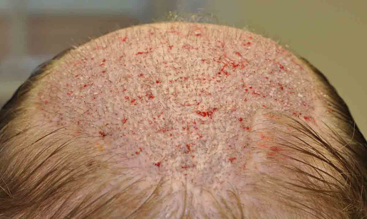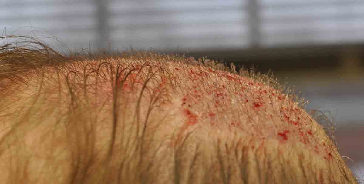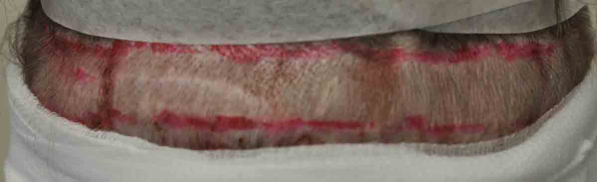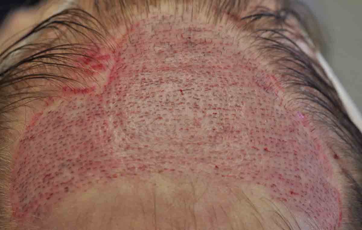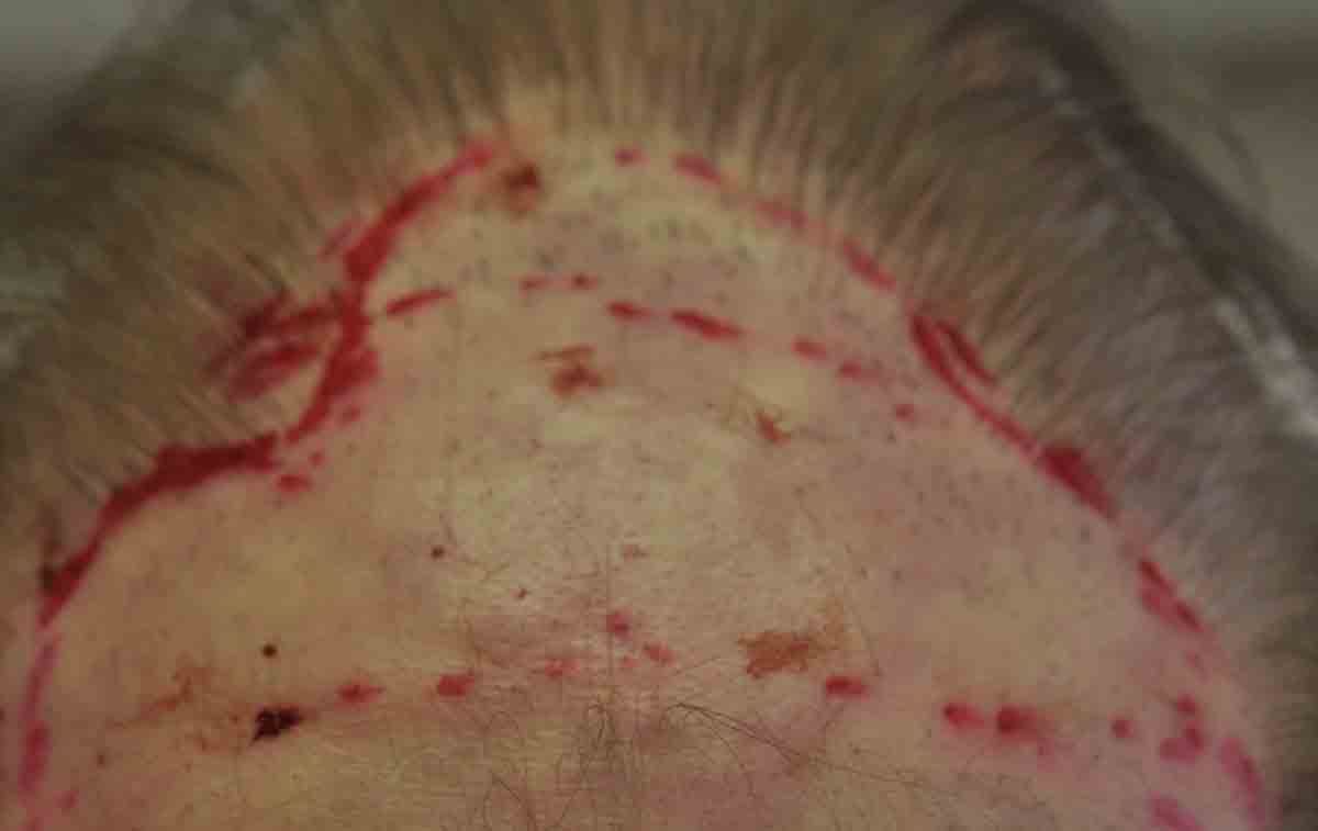 Shown are intraop and 1 week pics. Note that in the center donor area, there was a lot of scar tissue. Fortunately we got him down to only 1 scar on most of his scalp; although there was a lower area that I couldn't address.