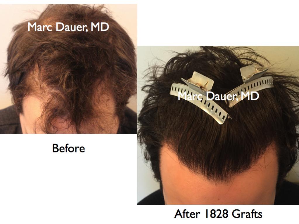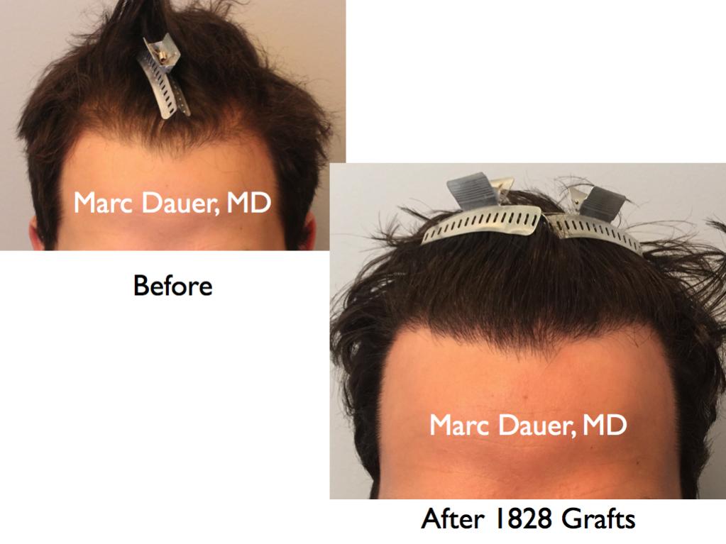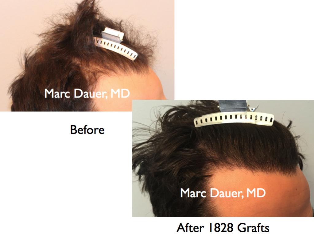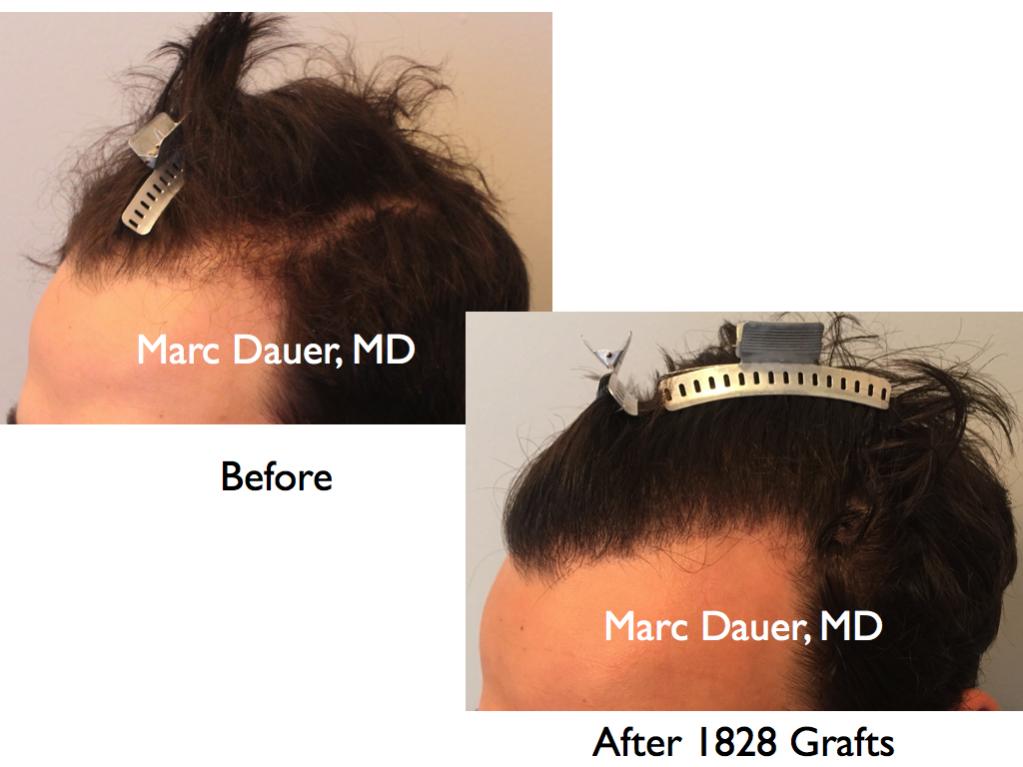 Here is a patient of mine who received 1828 grafts via FUT to the hairline and frontal scalp. The results are shown after 1 year.