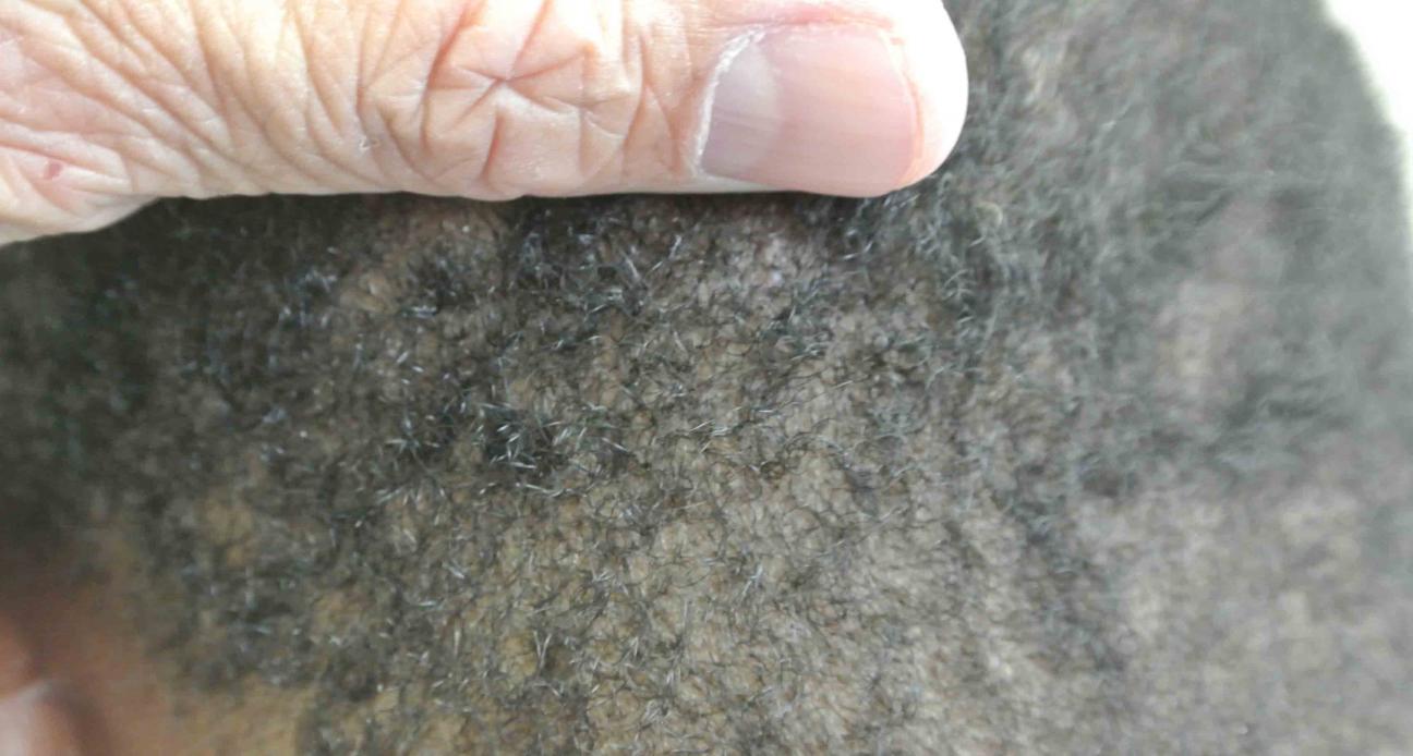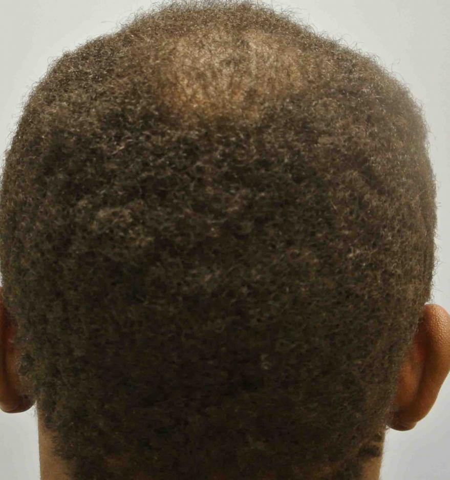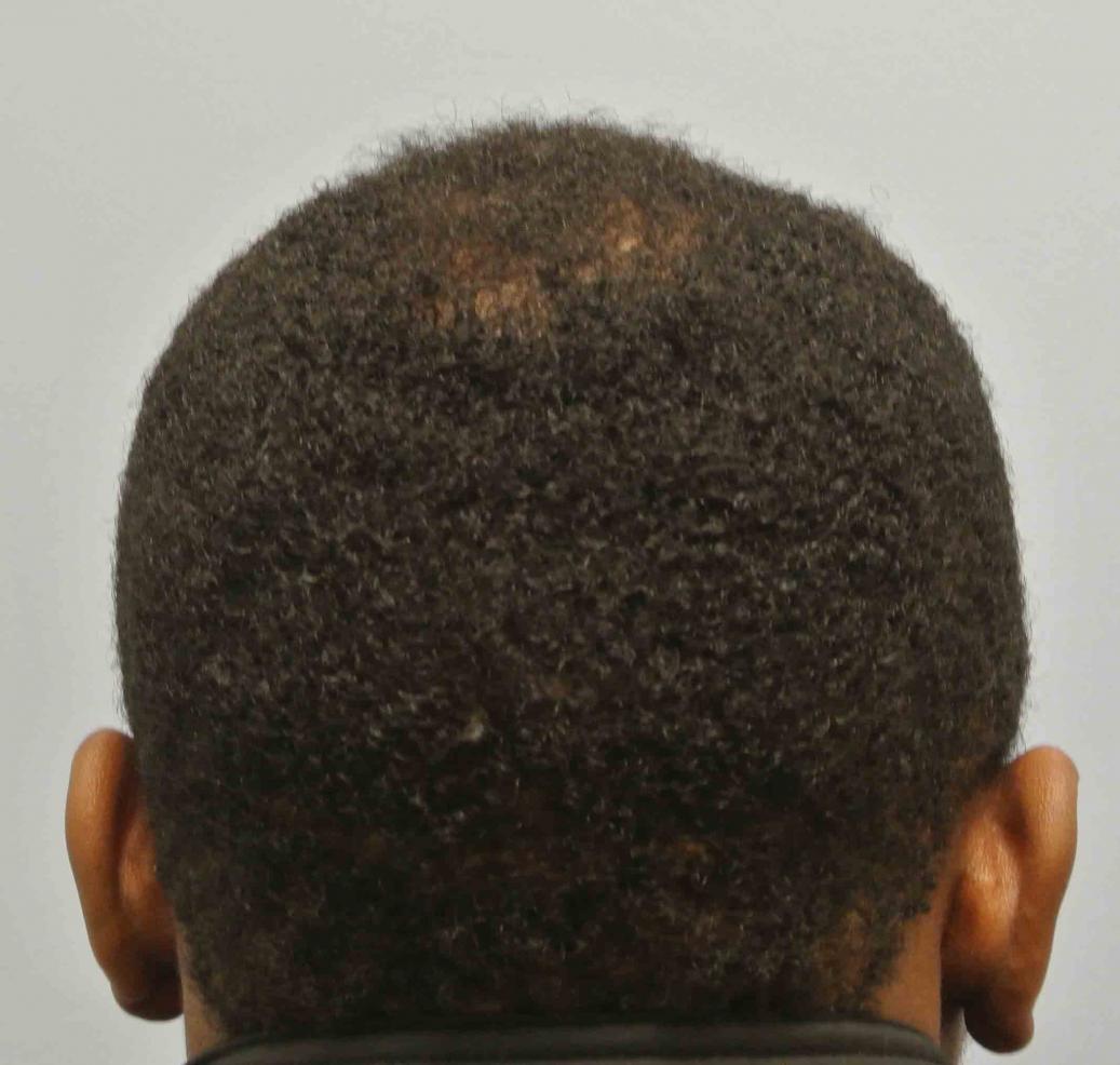 He's pretty young, likely to lose more hair, and doesn't have an unlimited donor supply. For many patients that would cause me to not offer surgery BUT he has a good hair/skin color match, and if one is going to go with a smaller case...only really curly bushy hair like he has will allow one to "get away with it" due to the excellent hairs covering way more bald scalp than most other patients...(in contrast you could never pull this off with a small case in a light skinned dark haired asian or fine haired european).