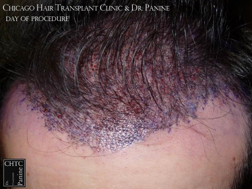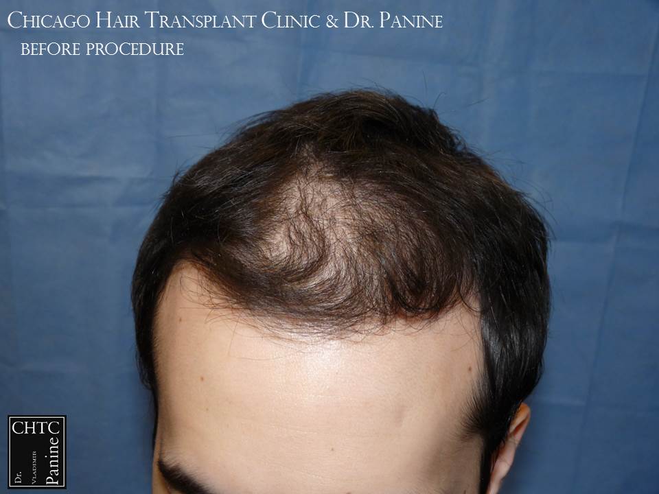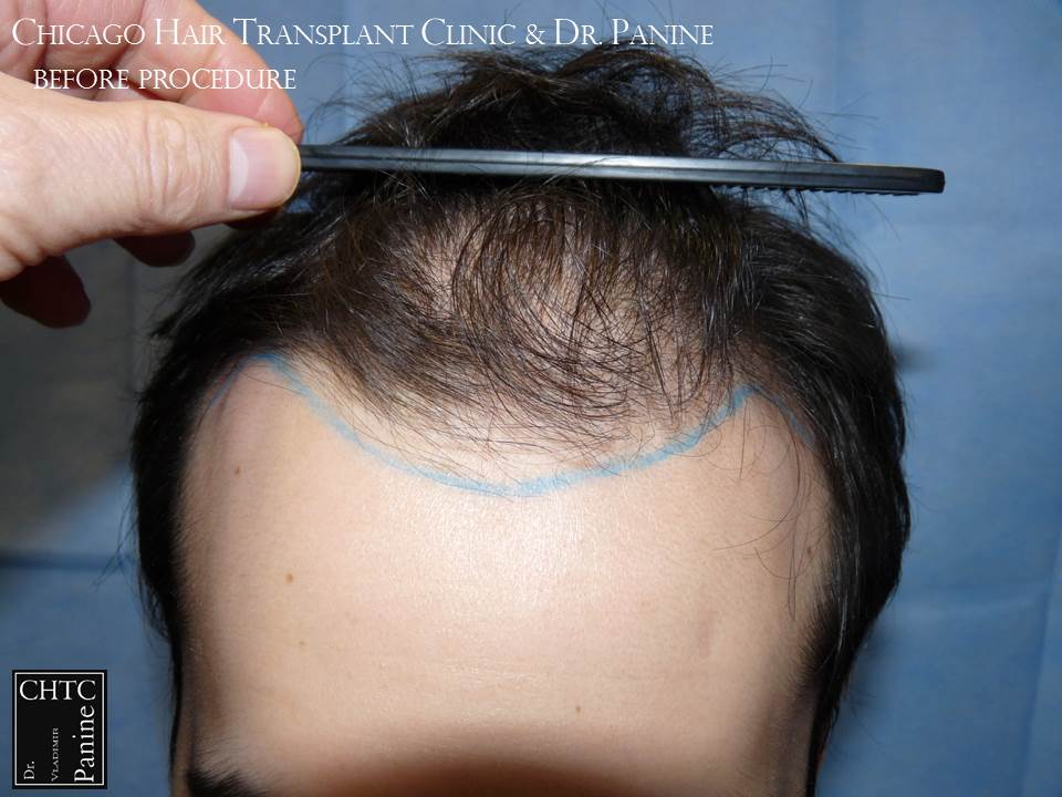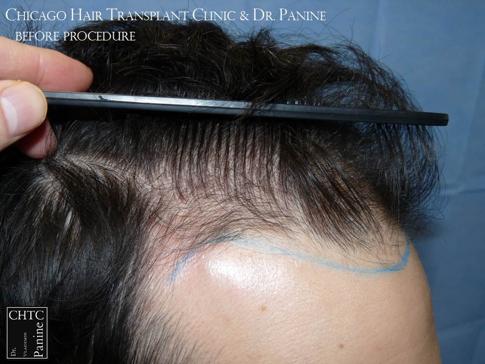 This 25 year old was a class 3 going into a class 4. After establishing his medical history and understanding the progression of his hair loss, I diagnosed his condition as Androgenetic Alopecia (male pattern baldness), ruling out any other possible dermatological or medical conditions which can cause hair loss. I explained to him that we need to take his age, present degree of hair loss and possible further hair loss into consideration when creating a surgical plan. I explained that it would be best to create a conservative hairline that will look good for him at 25 and also look good as he ages. It was also pointed out that with one procedure I would be able to add more coverage through the frontal 1/3 to ½ of his scalp. I also explained that there was a possibility that he could lose more of his own hair. If that was to happen, the transplanted hair would be able to stand alone and still look natural, but he would need another procedure to bring it back to the way it looks now.