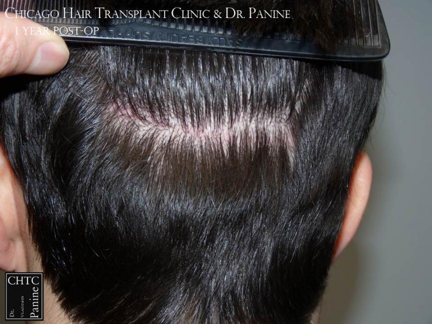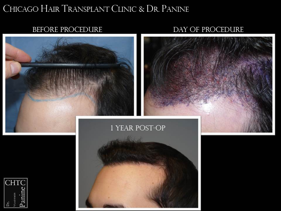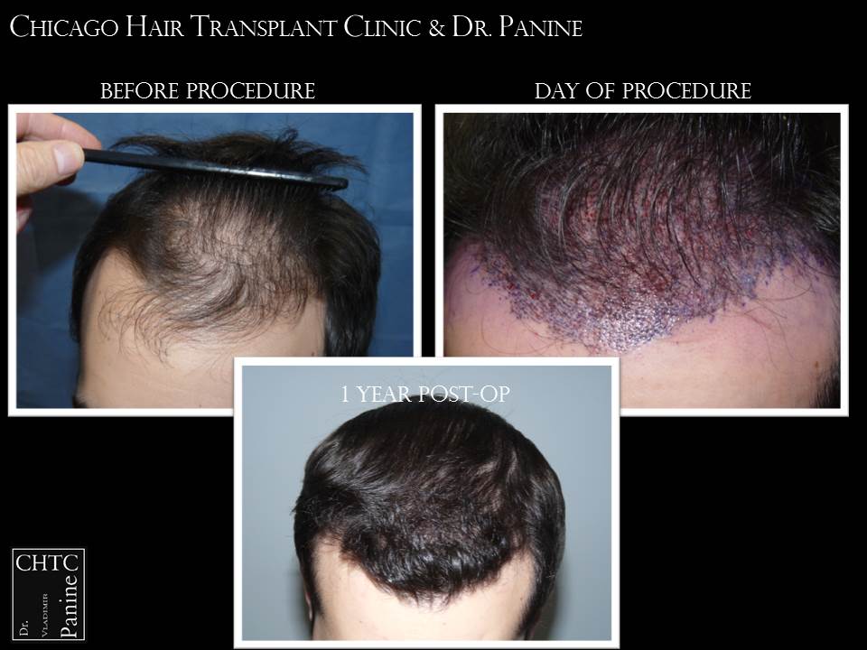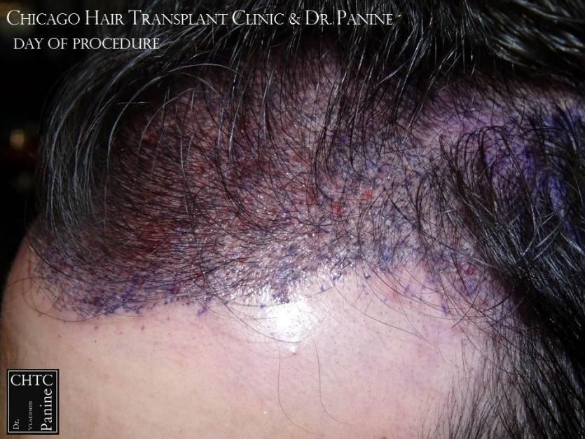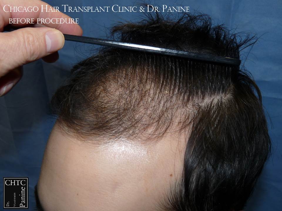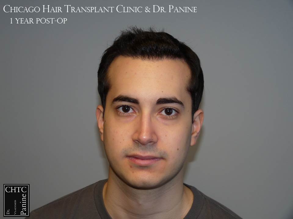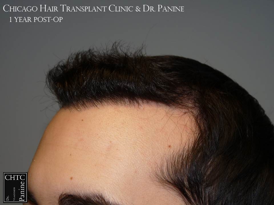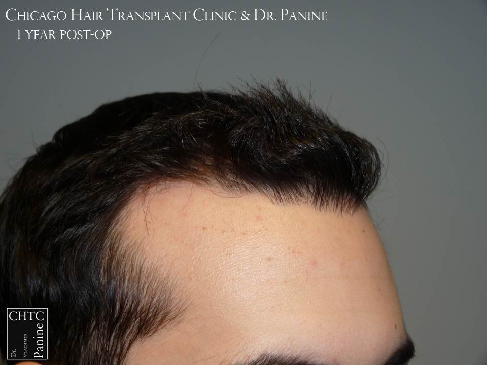 I was able to harvest 3,688 grafts. The break down was as follows: 1,419 single hair grafts, 2,068 two hair grafts and 201 3 hair grafts. I used a significant amount of single hair follicular units which allowed me to create a very natural hairline. This action will allow him to comb his hair without anyone detecting that he has had anything done. These are his results 1 year post-op. The patient is extremely happy with his results.