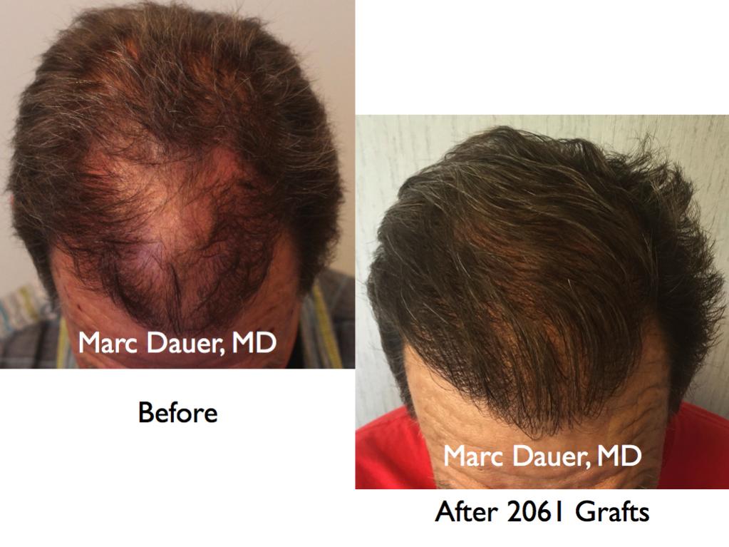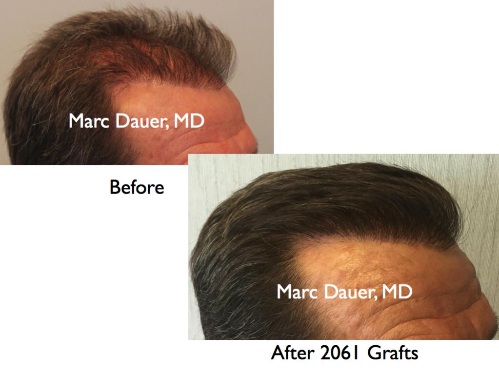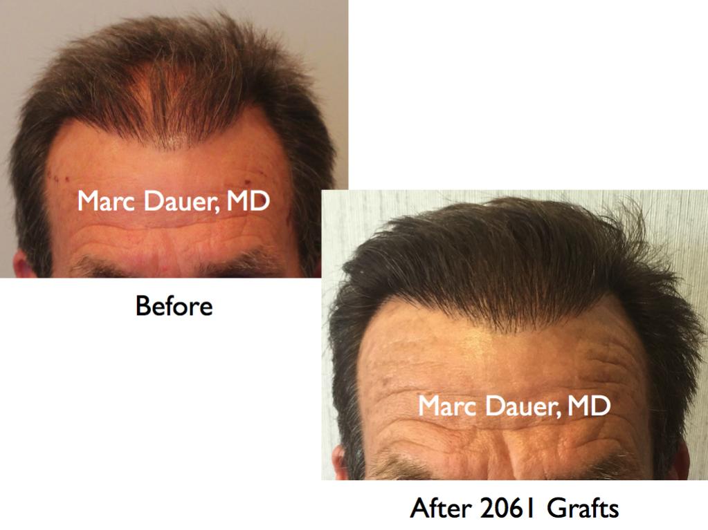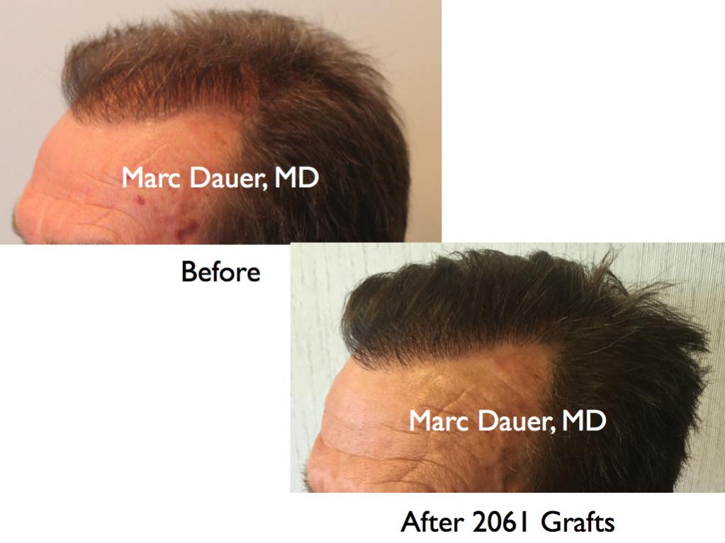 Here is a patient of mine with fine straight hair who received 2062 grafts via FUT to the frontal scalp. The results are shown after 12 months. The patient had received a hair transplant from another surgeon many years ago and was left with sparse density in the transplanted hairline and significant thinning behind the hairline and through the mid scalp. I created increased density in the hairline through the mid scalp in this procedure.