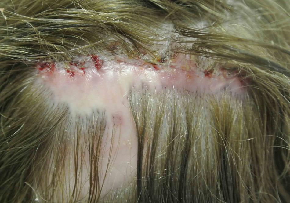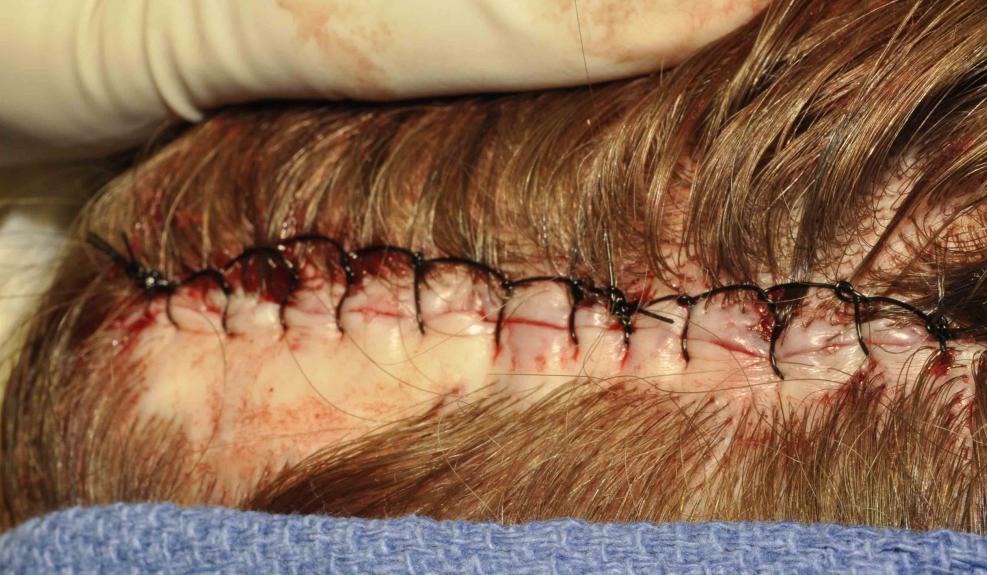 You'll note that when we excise large scars like this...its kind of like Forest Gump's box of chocolate....you never know what you'll get in terms of scalp laxity. Therefore I started at the top edge of the scar and initially excised about 40%. Then we pull the wound together and if there is still sufficient laxity, I excise more. I was able to get about 60 to 65% of the top scar out and do a 3 layer closure. I'm hopeful we'll be able to get all of the rest of it out in December...but it might take 2 more cases.