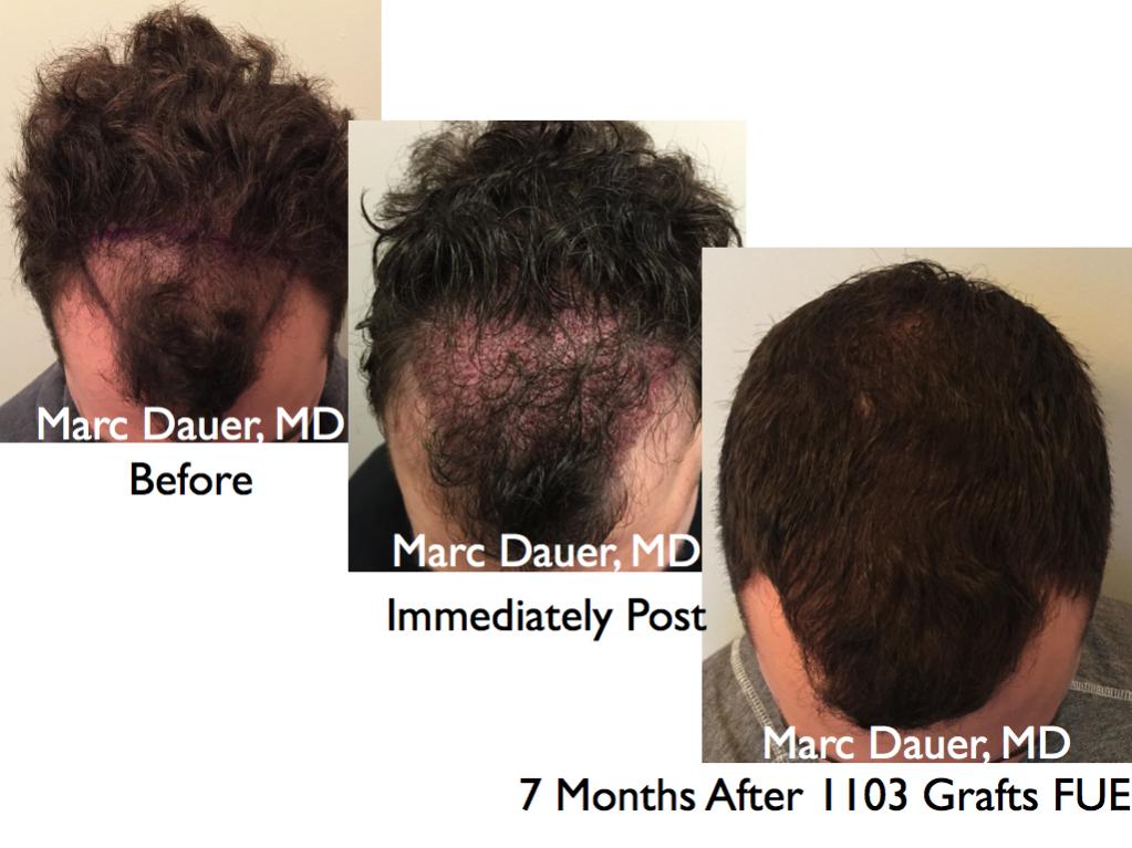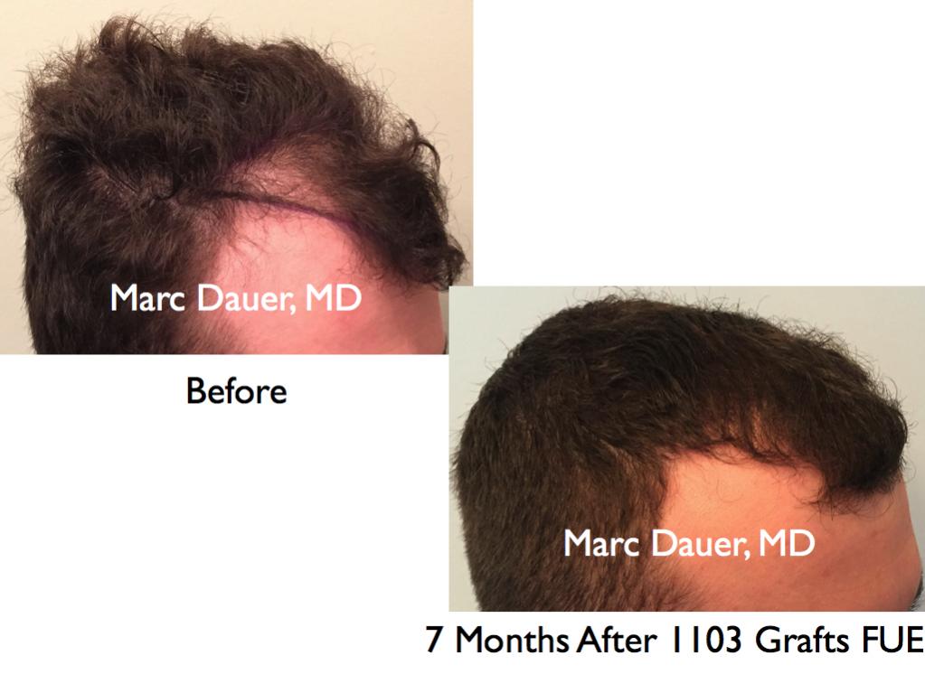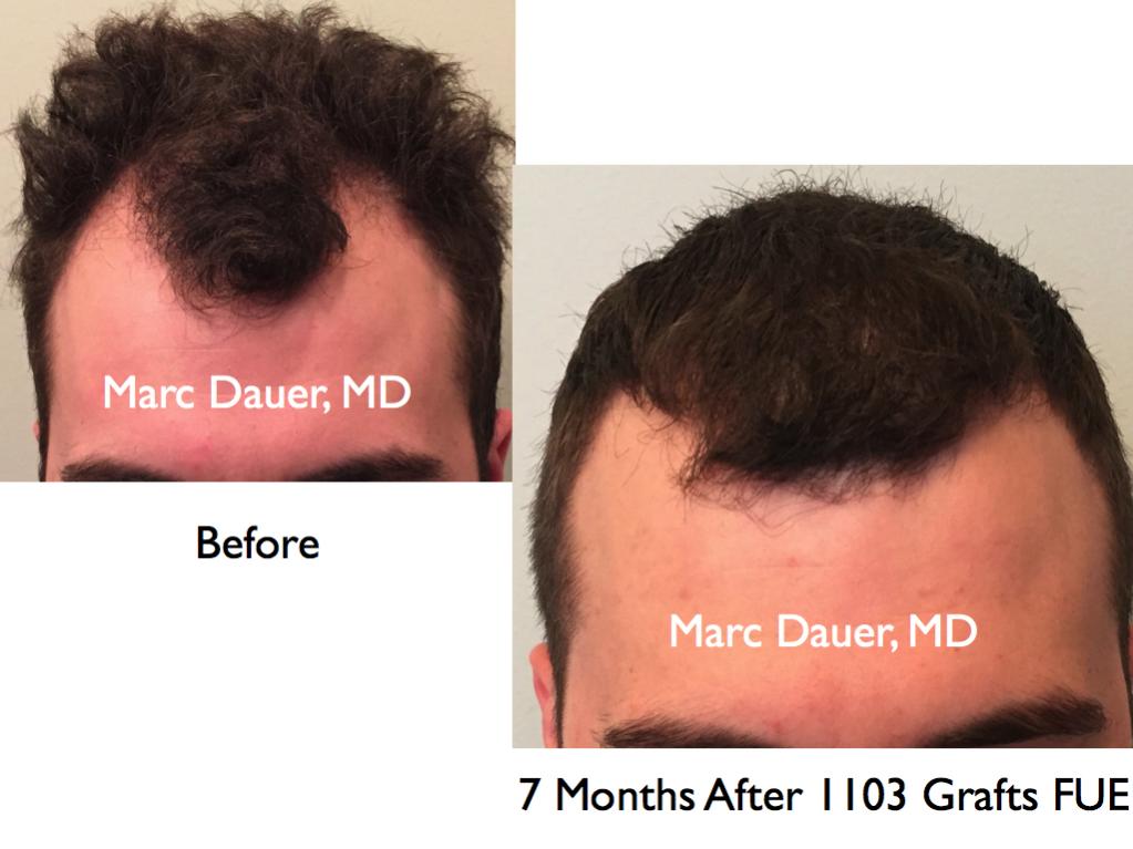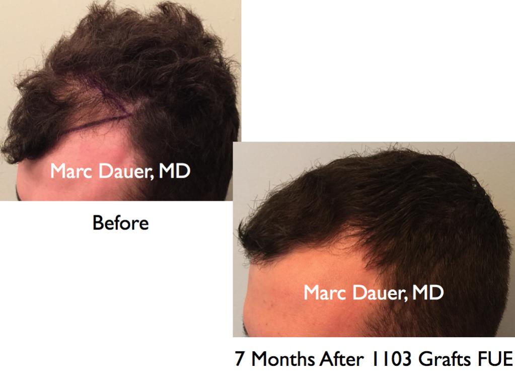 Here is a 27 year old patient of mine who received 1103 grafts via FUE to the frontal and mid scalp via FUE. The results are shown after 7 months so the patient should see some significant increased density over the next 6 months.