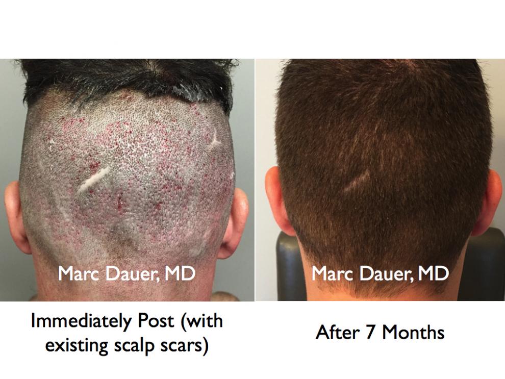 The donor region is also demonstrated, though it is important to acknowledge that the patient had multiple pre existing scalp scars in the donor region and these were not touched.