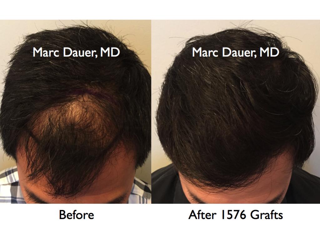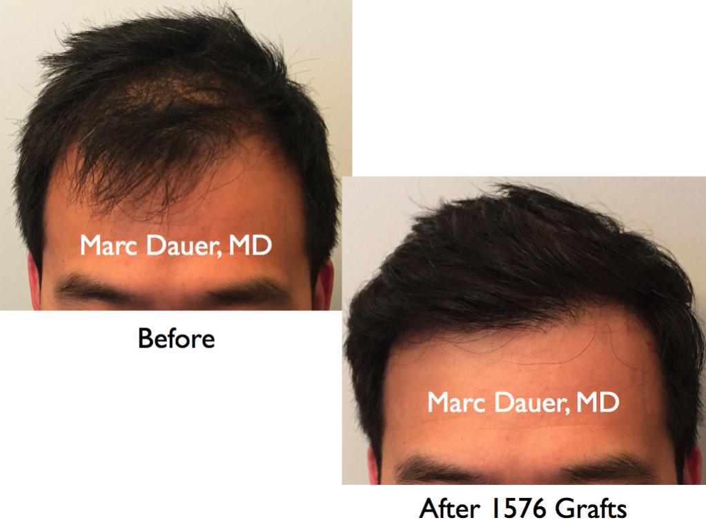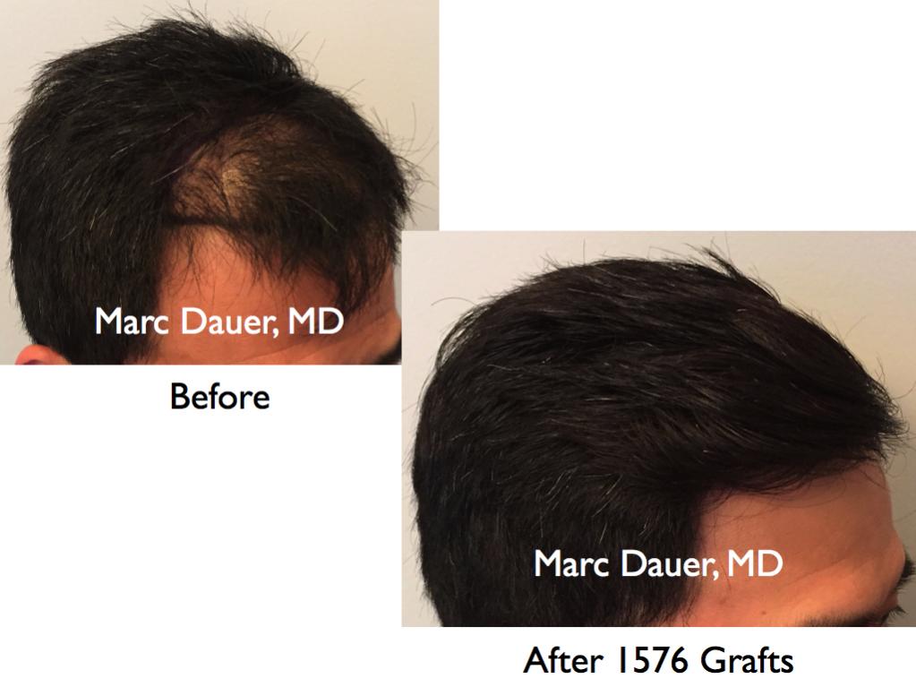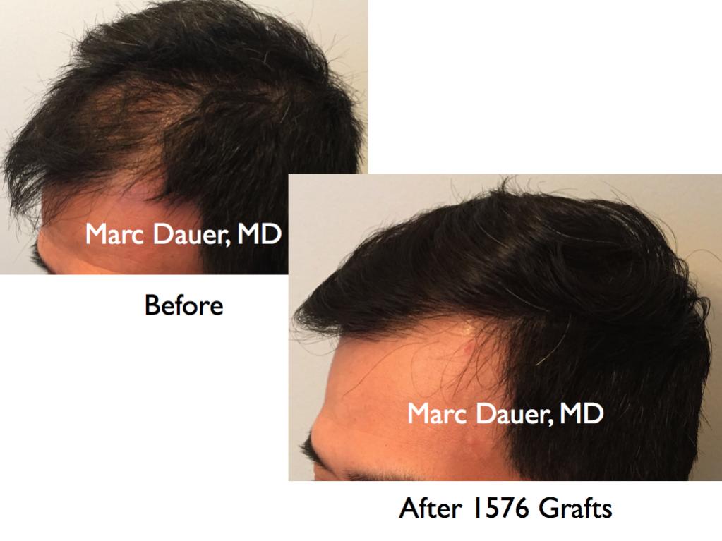 Here is a patient of mine who received 1576 grafts via FUT to the frontal and mid scalp. The 'after' results are shown after 9 months so the patient should see some increased cosmetic density over the next 3-6 months.