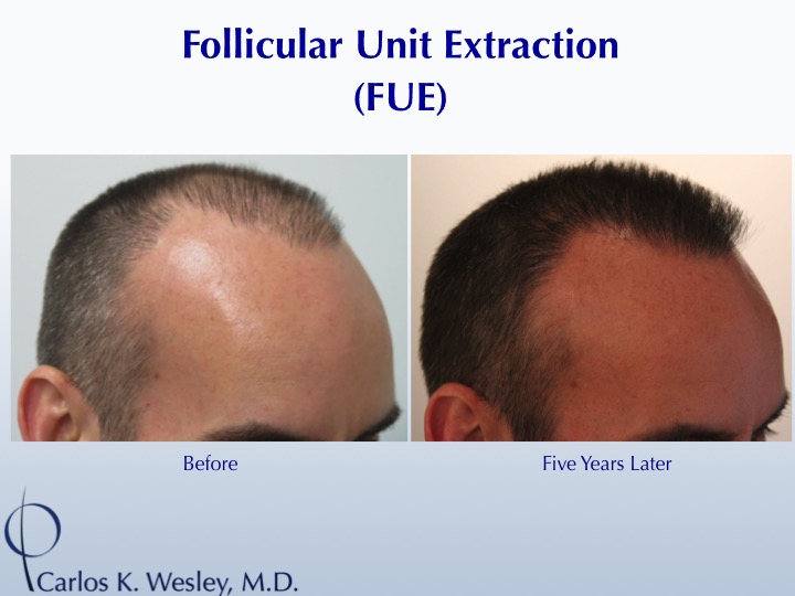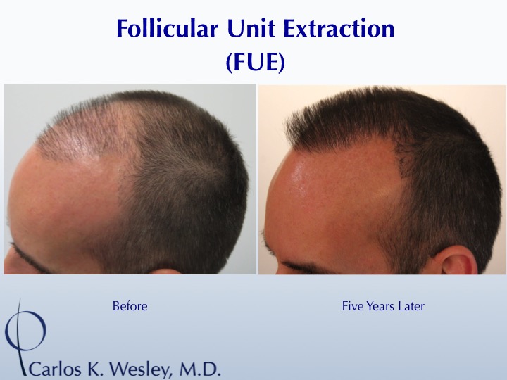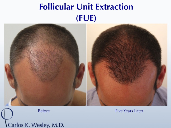 After having gone through 2 full strip harvest sessions at another North American clinic, this 46-year-old vowed to never have another hair transplant due to his hair's unnatural appearance. A friend of his convinced him to meet Dr. Carlos Wesley in NYC. After a series of discussions and a 2184-graft follicular unit extraction (FUE) session in which both scalp and beard hair were harvested, this patient was both relieved and thrilled to have a new, more natural-appearing hair distribution one year later.