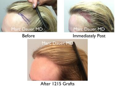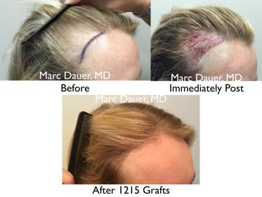 Here is a female patient of mine who had genetically weak temporal recessions bilaterally. She received just over 600 grafts to each side and the results are shown after 12 months.