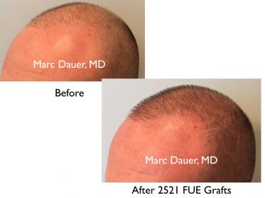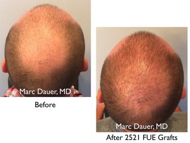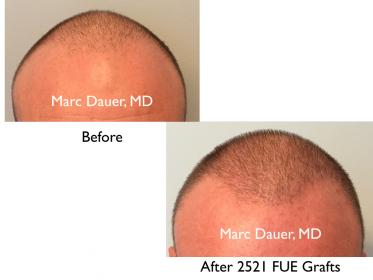 Here is a patient of mine who is a Norwood 6 with very fine straight hair. He underwent a very small FUE procedure in the past with another physician and he was looking to create significantly more density in the frontal scalp, mid scalp, and crown. Despite the fact that this is a very large area of space to cover with just over 2500 grafts, I maintained a very conservative hairline in order to maximize density results. The patient also had slightly below normal donor density which is why I opted to not take more grafts in this session. I keep all the follicular units intact as opposed to dissecting the 2-4 hair grafts into smaller follicular units in order to maximize cosmetic density. I use only natural single hair grafts in the hairline.
