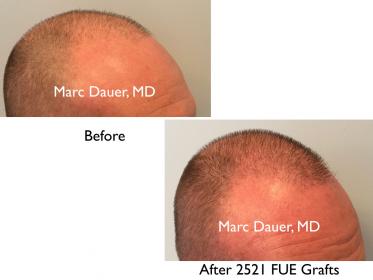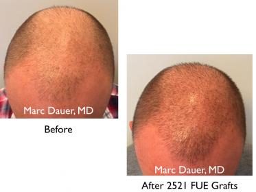 Despite the very short haircut that the patient wears, he is thrilled with his results and wants to have another procedure in the near future for even more cosmetic density.