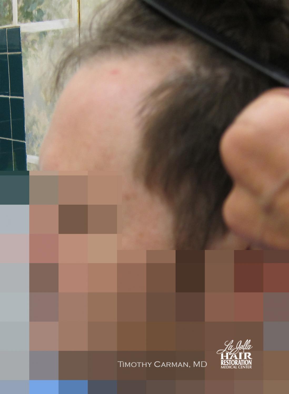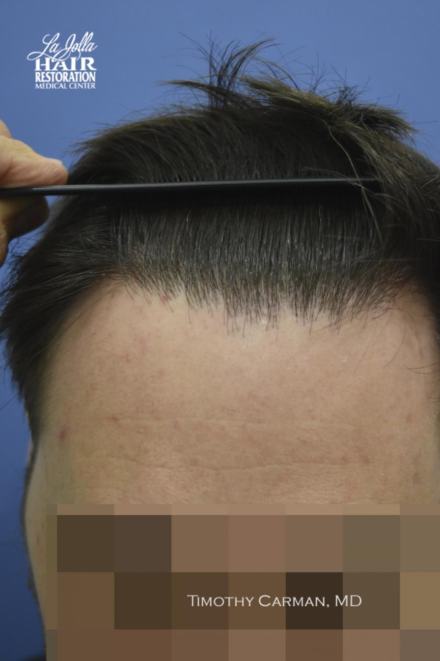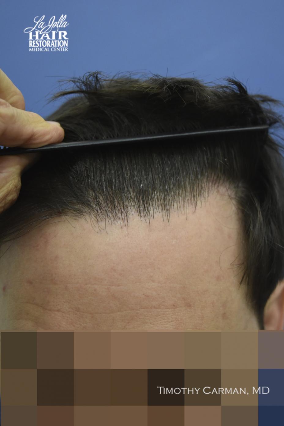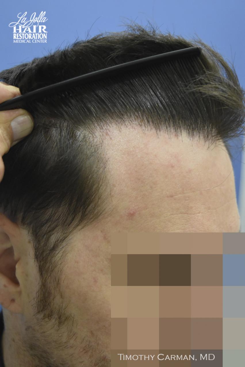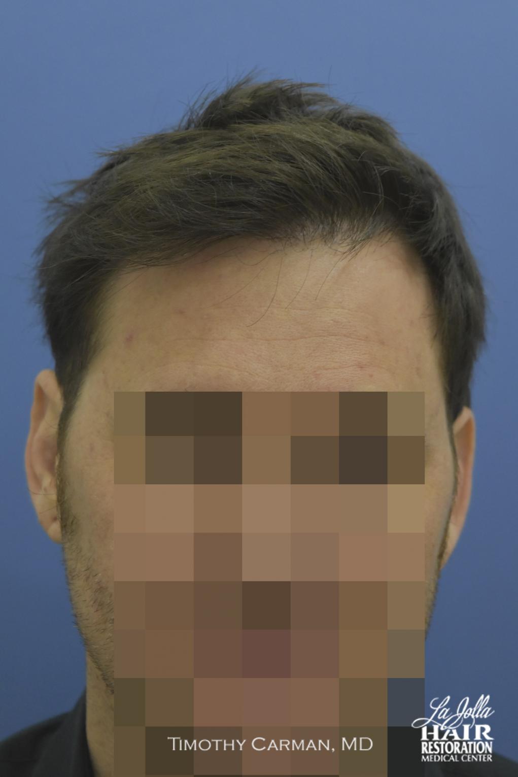 This patient is a 32 YO male who experienced loss of definition of the frontal hairline which is consistent with his fathers pattern. There is no family history nor clinical evidence in this patient of crown thinning. Two procedures of 1601 FU grafts and 1609 FU grafts were performed a year apart, to obtain the final hairline shape, location and density.