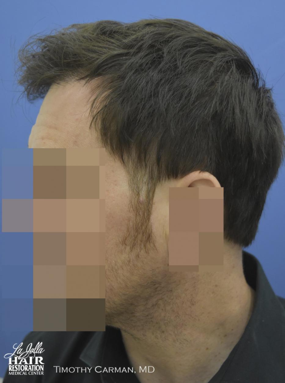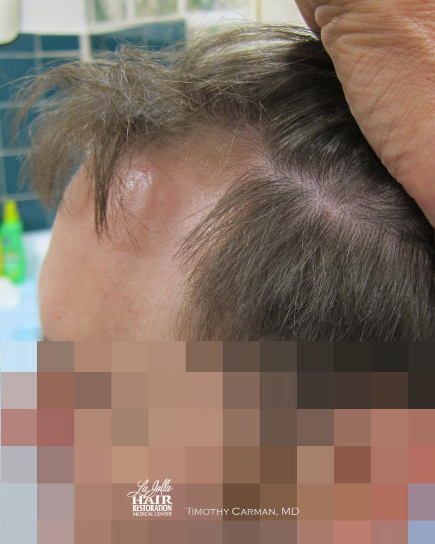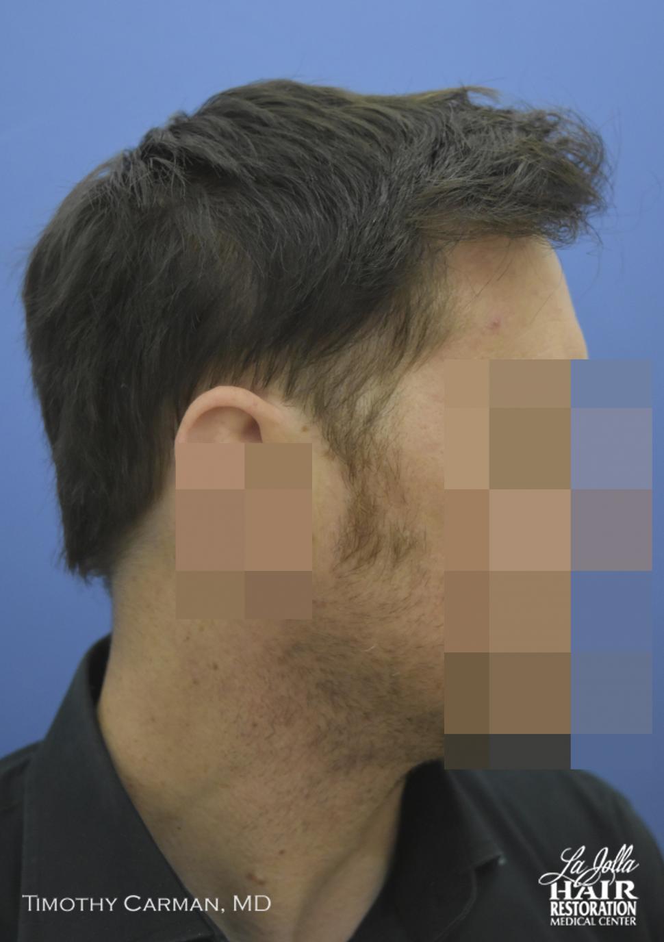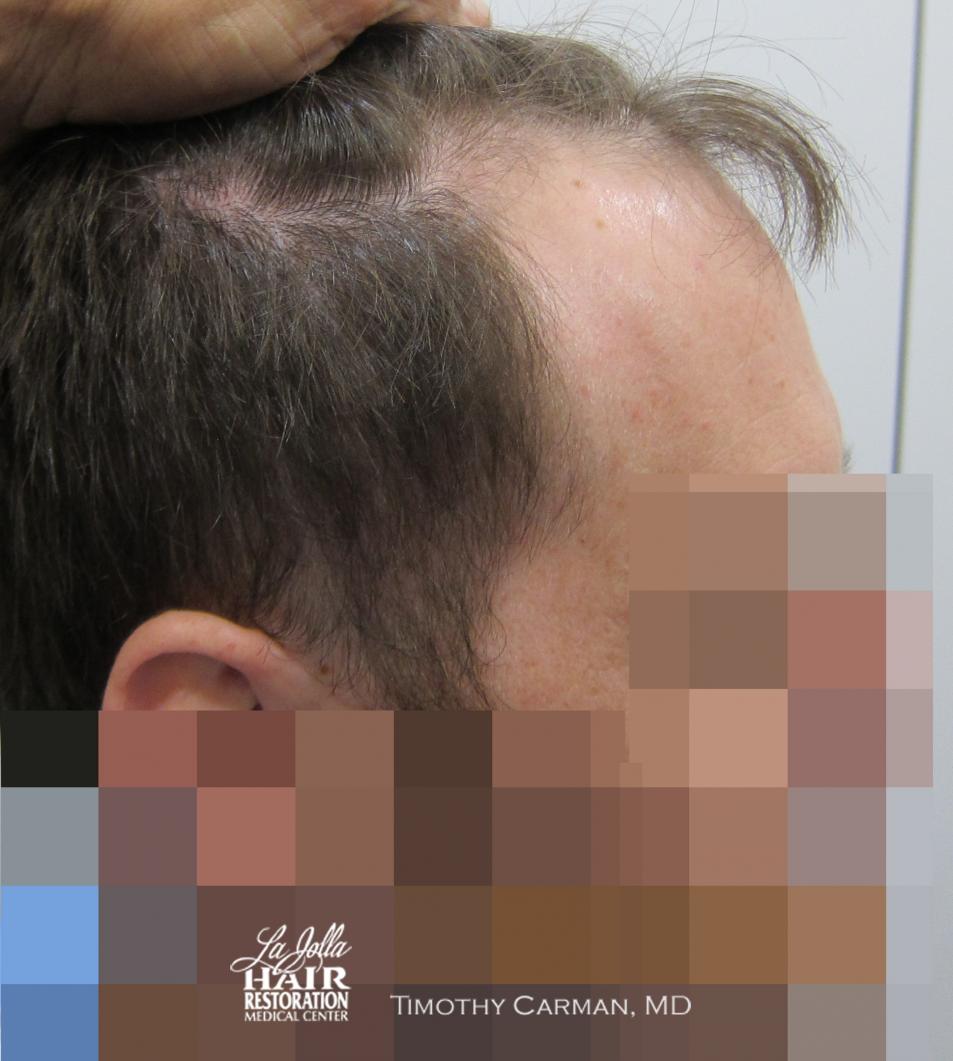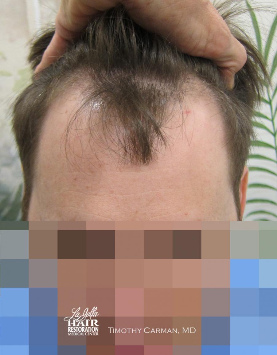 This patient is a 32 YO male who experienced loss of definition of the frontal hairline which is consistent with his fathers pattern. There is no family history nor clinical evidence in this patient of crown thinning. Two procedures of 1601 FU grafts and 1609 FU grafts were performed a year apart, to obtain the final hairline shape, location and density.