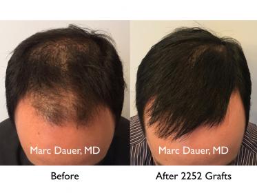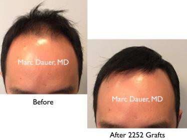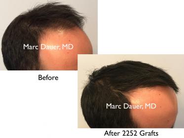 Here is a 30 year old patient of mine who received 2252 grafts via FUT to the frontal and mid scalp. The results are shown after 10 months. We kept the hairline in a conservative location because of the young age of the patient and the expectation that he will lose significantly more native hair over time. The patient is not taking propecia.