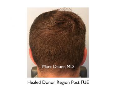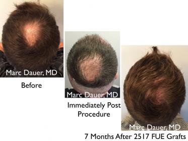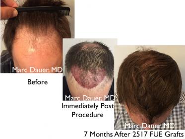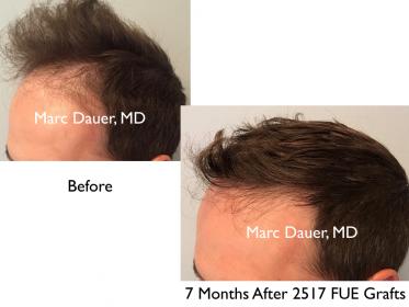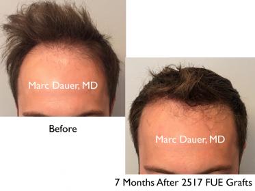 Here is a patient of mine in his mid 30's who received just over 2500 grafts 7 months ago via FUE. I used a 0.8mm motorized punch to personally extract each follicle. Approximately 1800 grafts were placed in the frontal and mid scalp and the remaining 700 + were placed into the crown.