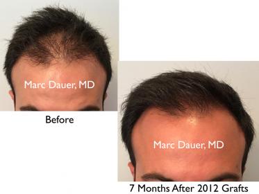Here is a patient of mine who received approximately 1500 grafts to the frontal scalp and 500 grafts to the crown via FUT. The results are shown after only 7 months. The growth is impressive at this point but the patient should see 30-40% increase cosmetic density over the next 6 months as the hair follicles thicken in caliber.